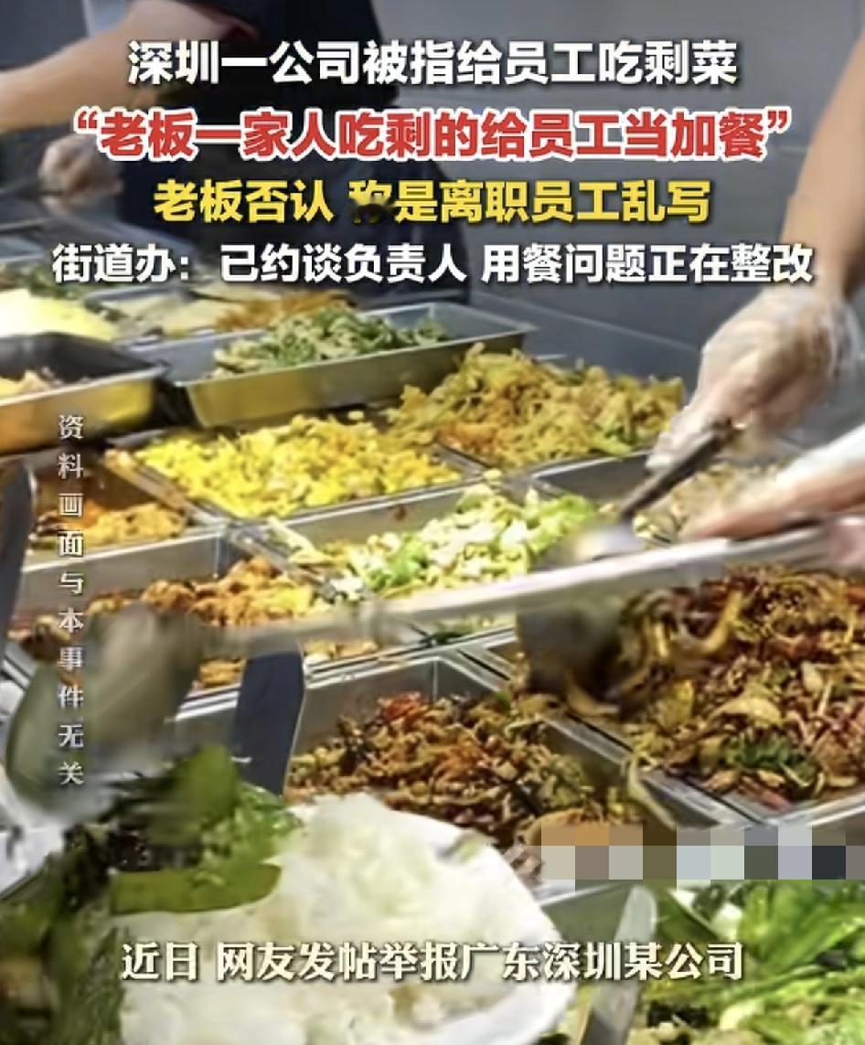 深圳一公司有员工爆料称公司家里人吃剩的菜经过加热,再给其他的同事吃,员工称该公司就餐的时候不分桌,吃剩的菜再放回厨房,公司老板家里人吃饭有小圆桌,也是同样把吃剩的菜之后再加热分给上夜班的员工吃。公司老板否认此事,只是说明离职的员工乱写的,目前街道办已经在核实,并命令公司的食堂整改。