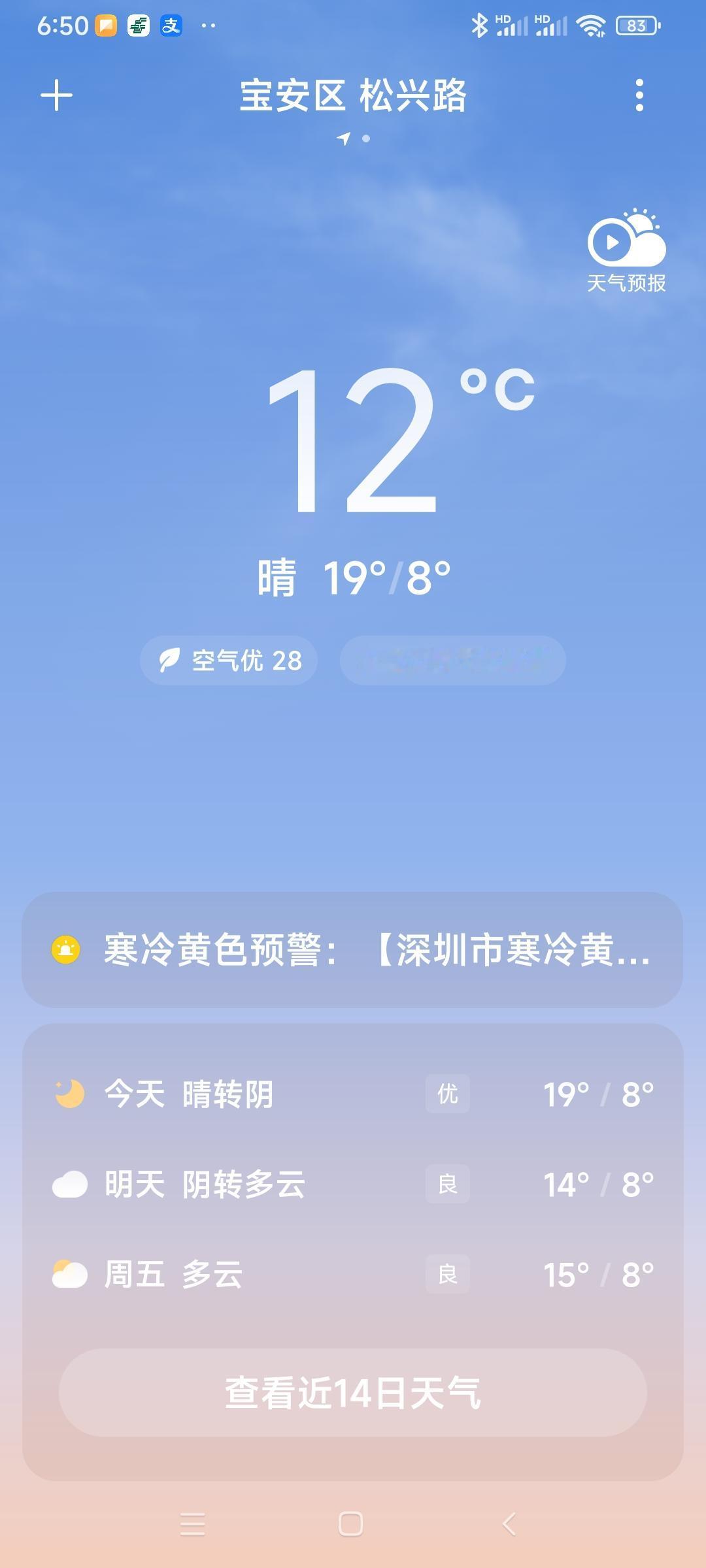 我的今日状态:😁轻松愉快 我这里的天气:☀️晴天深圳今日晴,气温8度到19度,湿度65度!今日深圳也有点冷了,注意加衣保暖![作揖]