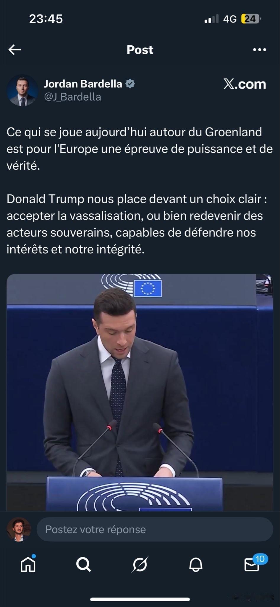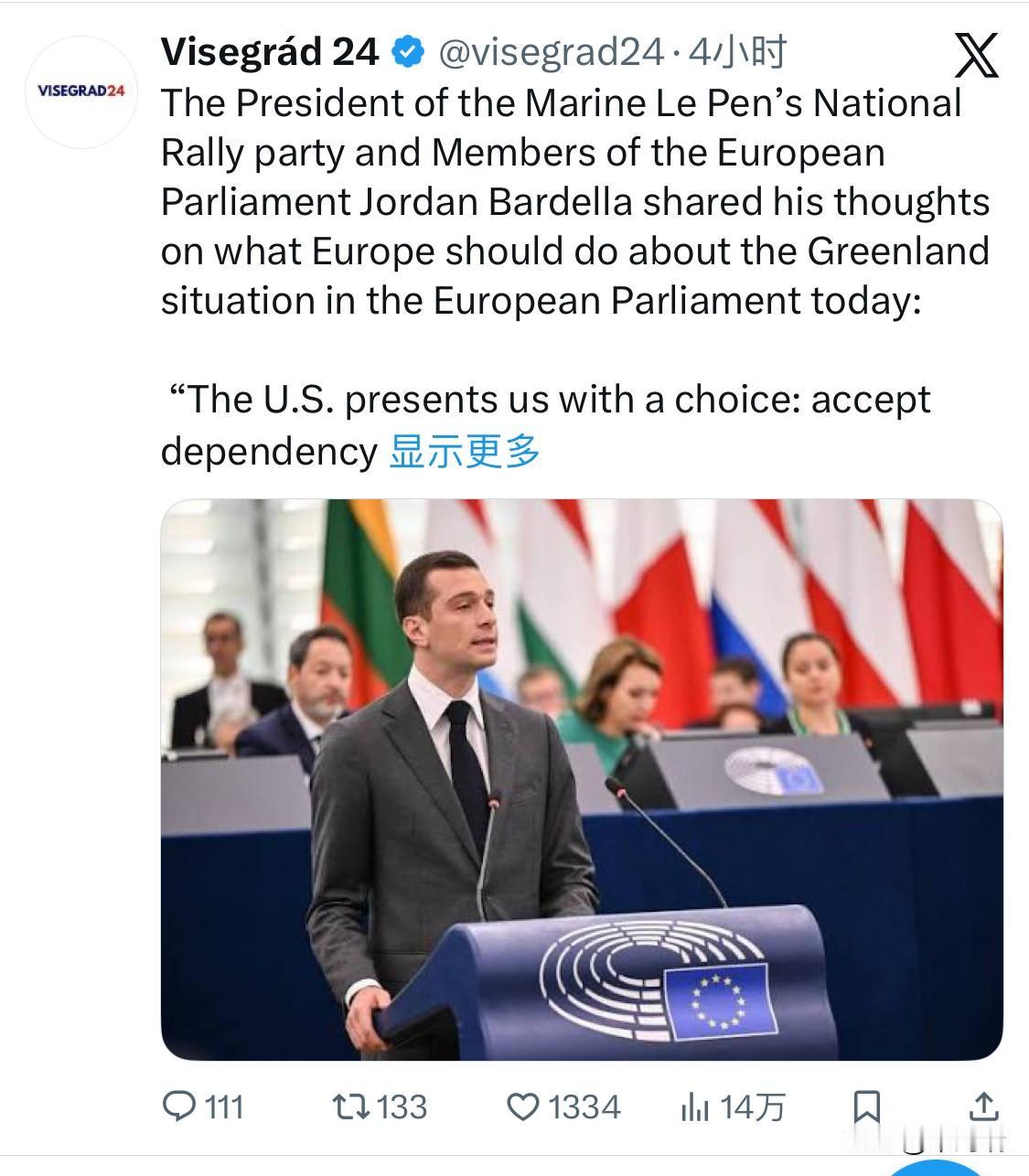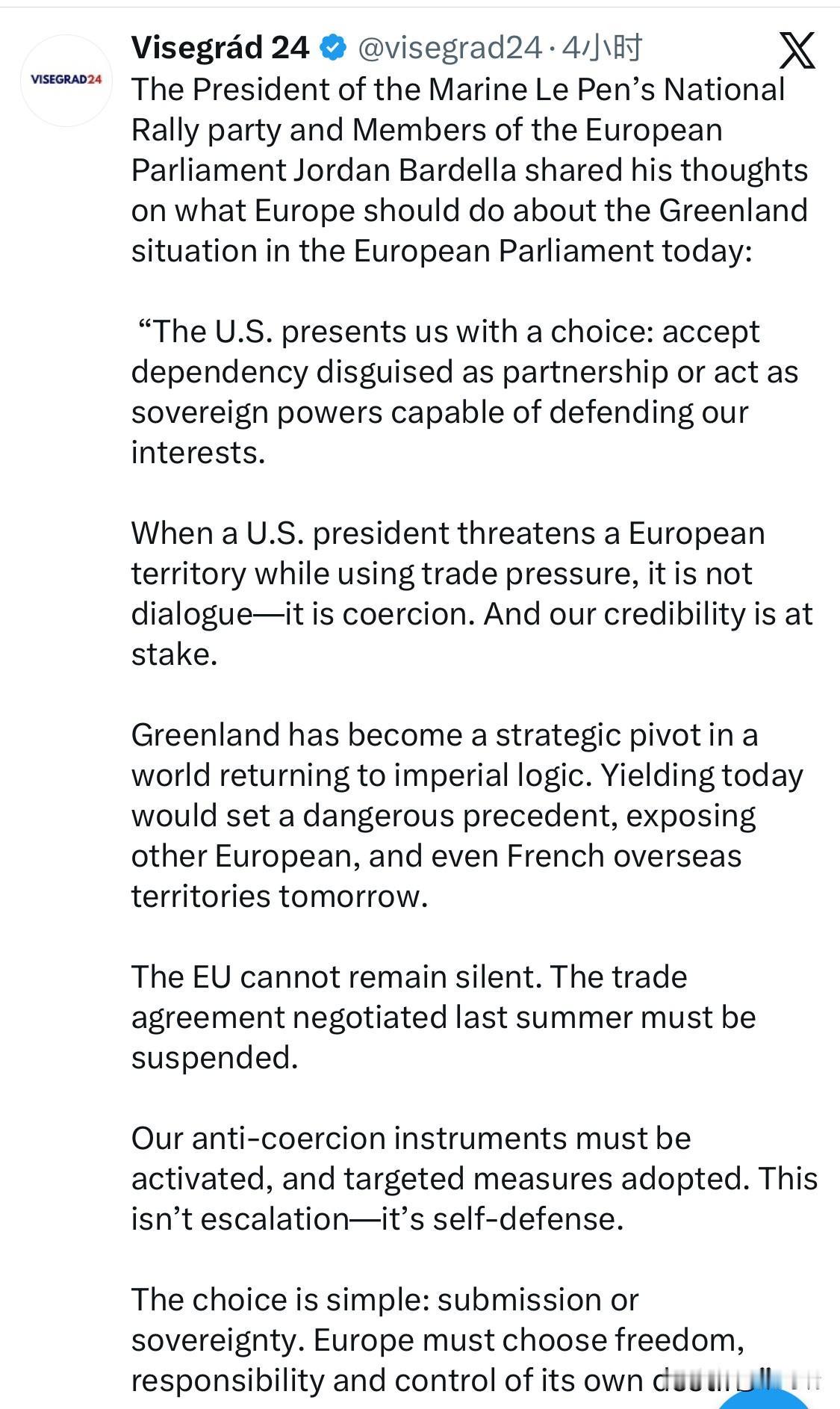 2026年1月20日,国民联盟(RN)主席、欧洲议会议员乔丹·巴尔德拉(Jordan Bardella)在欧洲议会发表讲话,针对美国总统特朗普试图吞并格陵兰岛及对欧施加关税压力一事,表达了强硬立场。 以下是他在讲话及近期表态中的核心看法: 1. 捍卫主权:拒绝“帝国野心” 巴尔德拉将美国对格陵兰岛的企图描述为“帝国主义野心的回归”,并强调格陵兰岛是欧洲领土不可分割的一部分。他指出: 不可接受的挑衅:美国的做法是对欧洲国家领土主权的直接挑战。 拒绝霸权:他批评当今世界正陷入“强权凌驾于国际规则之上”的境地,指责特朗普的行为公然漠视国际法。 2. 经济对策:启动“贸易大炮”据 面对特朗普针对反对其格陵兰政策的8个欧洲国家(包括法国)威胁征收10%至25%的惩罚性关税,巴尔德拉敦促欧盟采取反制措施: 激活防胁迫工具(ACI):他公开要求欧盟委员会立即启动被称为“贸易大炮”或“核选项”的防胁迫工具(Anti-Coercion Instrument),对美国的服务和出口实施针对性限制。 中止贸易协议:他呼吁暂停欧盟与美国于2025年夏天签署的贸易协定,称美国的行为是“商业勒索”。 3. 欧洲立场:主权而非依附 巴尔德拉向欧洲各国领袖喊话,要求在“屈服”与“主权”之间做出选择: 结束系统性瘫痪:他批评欧盟如果不能在捍卫自身利益时发出有力声音,将再次证明其“系统性瘫痪”。 自我防卫:他强调采取反制措施并非为了升级冲突,而是出于“自卫”,是维护欧洲自由与信誉的必要举动。 4. 政治背景与转变 巴尔德拉的这一立场标志着国民联盟与特朗普关系的显著转向。尽管该党在移民、环保怀疑论等议题上曾与特朗普有共同点,但此次格陵兰危机和关税威胁已导致双方关系出现裂痕。在法国国内,巴尔德拉的强硬立场也被视为在2027年大选前展示其作为国家主权捍卫者的形象。