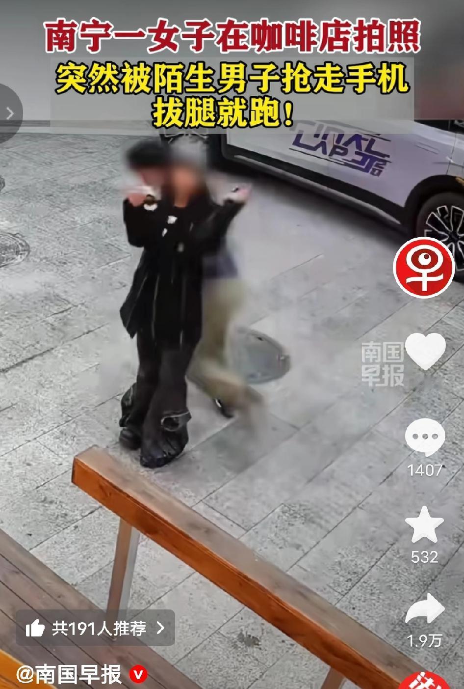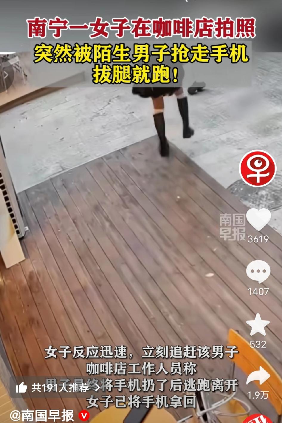 太惊险!广西南宁,一网红咖啡店门口,一女子正摆姿势拍美照,陌生男子突然冲过来一把抢走手机拔腿就跑!没想到姑娘反应神速,当场开启百米冲刺狂追,最终逼得男子扔机逃窜! 2026年1月20日,南宁青秀区这家网红咖啡店门口的木质平台前,阳光正好,一名穿黑色短裙、长靴的年轻女子正举着手机对着镜头调整角度,准备拍下打卡照。她旁边的落地玻璃窗里,坐满了喝咖啡的顾客,谁也没注意到危险正在靠近。 就在她侧身摆姿势、注意力全在镜头上的瞬间,一名陌生男子突然从侧面冲了过来,一把攥住她的手机转身就跑,动作快得让人来不及反应。 “我的手机!”女子愣了一秒后立刻回过神,踩着靴子就追了上去,高跟鞋踩得“哒哒”作响。咖啡店的店员听到呼喊,也立刻起身冲出门帮忙拦截。 男子慌不择路地拐进旁边的老巷,巷子里堆满了杂物,他跑得跌跌撞撞。眼看女子紧追不舍,还引来店员围堵,他干脆把手机往路边的垃圾桶旁一扔,头也不回地钻进了巷尾的居民楼里。 女子捡起失而复得的手机,屏幕已经摔出了裂纹,她心还在怦怦直跳。事后她第一时间报了警,目前警方已经调取了咖啡店及周边的监控录像,正在全力追查该男子的下落。 她后来说:“当时脑子里一片空白,就想着不能让手机被抢走,里面存着工作资料和家人照片。现在想想还是有点后怕,但当时根本顾不上害怕。” 网友评论 - “姑娘太勇了!反应速度堪比短跑运动员,换我可能就懵了。” - “网红店人多眼杂,拍照时真的要留意周围,别光顾着看镜头。” - “幸好没造成损失,但这种随机抢夺太吓人了,希望警方尽快抓到人。” - “女孩子遇到这种情况还是要先保证安全,追的时候一定要注意周围环境。” 拍照打卡的好心情,差点被一场抢夺毁了。你在公共场合遇到过类似的突发状况吗? 南宁咖啡店抢手机事件 网红店安全提醒 争议民生 女子狂奔追小偷 南宁身边事 来源:南国早报及网络公开内容,如有侵权请联系即删 配图说明:本文配图/视频素材来自抖音@南国早报,仅用于内容分享,侵权联删