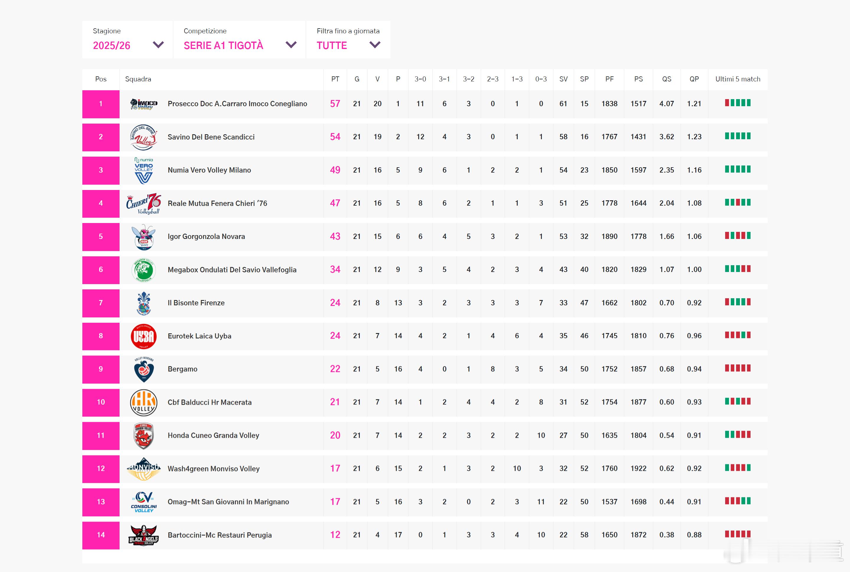 国际排坛动态庄宇珊皮内罗洛拼了五局,3-2艰难击败布斯托阿西齐奥拿到了2分,又将圣乔瓦尼挤回了降级区,但还有打,常规赛还有五轮,雨刷加油! 科内利亚诺 20胜1负,57分斯坎迪奇 19胜2负,54分米兰 16胜5负,49分基耶里 16胜5负,47分诺瓦拉 15胜6负,43分瓦莱福利亚 12胜9负,34分佛罗伦萨 8胜13负,24分布斯托阿西齐奥 7胜14负,24分贝加莫 5胜16负,22分马切拉塔 7胜14负,21分库内奥 7胜14负,20分皮内罗洛 6胜15负,17分圣乔瓦尼 5胜16负,17分佩鲁贾 4胜17负,12分中国女排