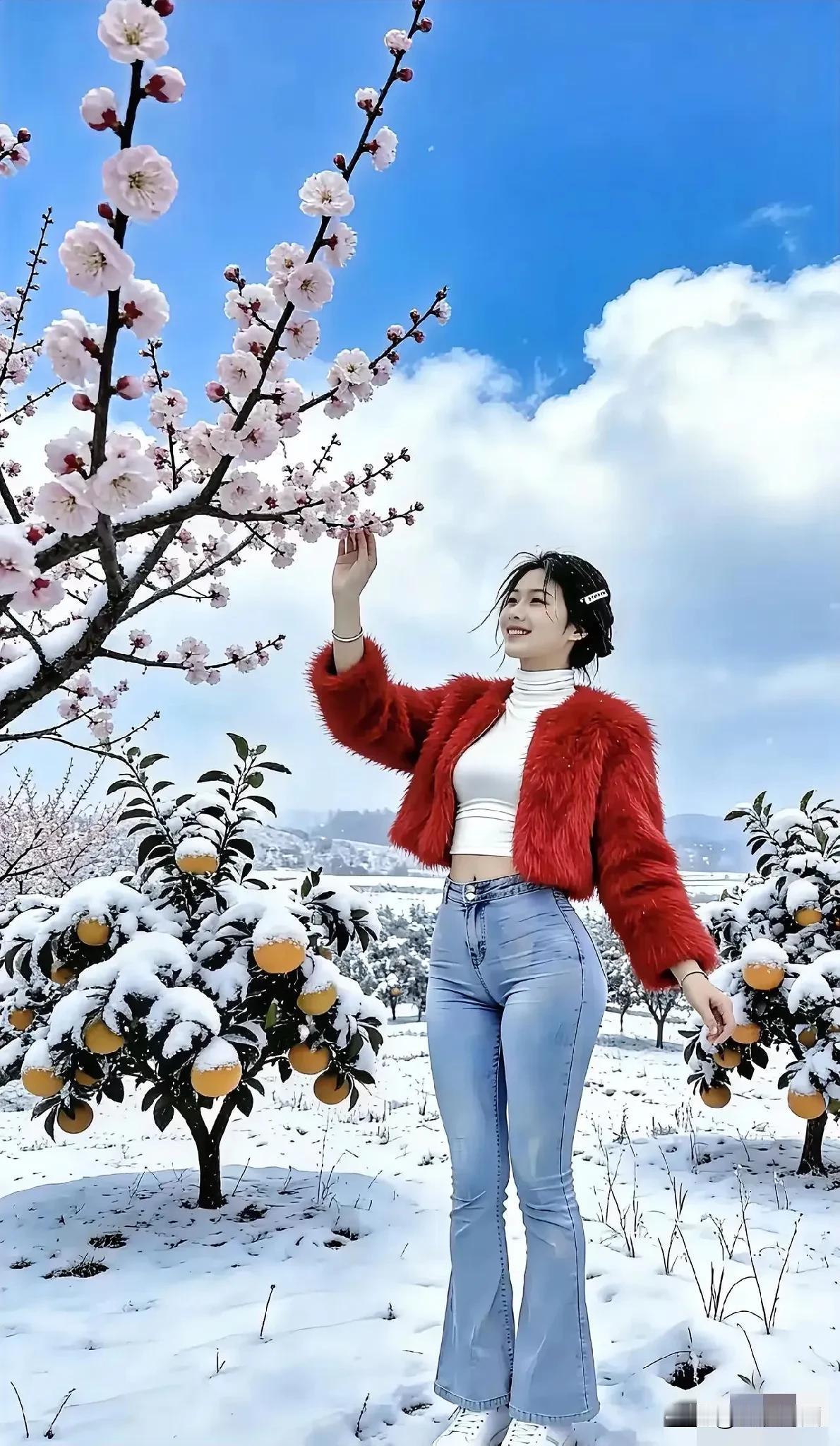 雪中赏芳者,红衣衬花枝。雪地红衣女子 雪中赏梅 赏梅拍照 雪中红装照