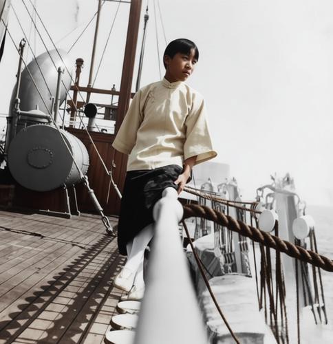 1923年8月17日冰心从上海启程、远赴美国留学的瞬间。 她正坐在轮船的木质甲板的围栏上,中式上衣配着深色下装,利落的短发衬着青年学子的朝气。脚下的甲板纹理粗粝,一旁粗麻绳护栏在海风里微微绷紧,远处船的烟囱、桅杆在朦胧的天光里舒展着轮廓,仿佛还带着港口未散的潮气。她的目光轻落向远方,身影在斜斜的日光里投下淡影,既有奔赴新知的期许,也藏着对故土的眷恋。