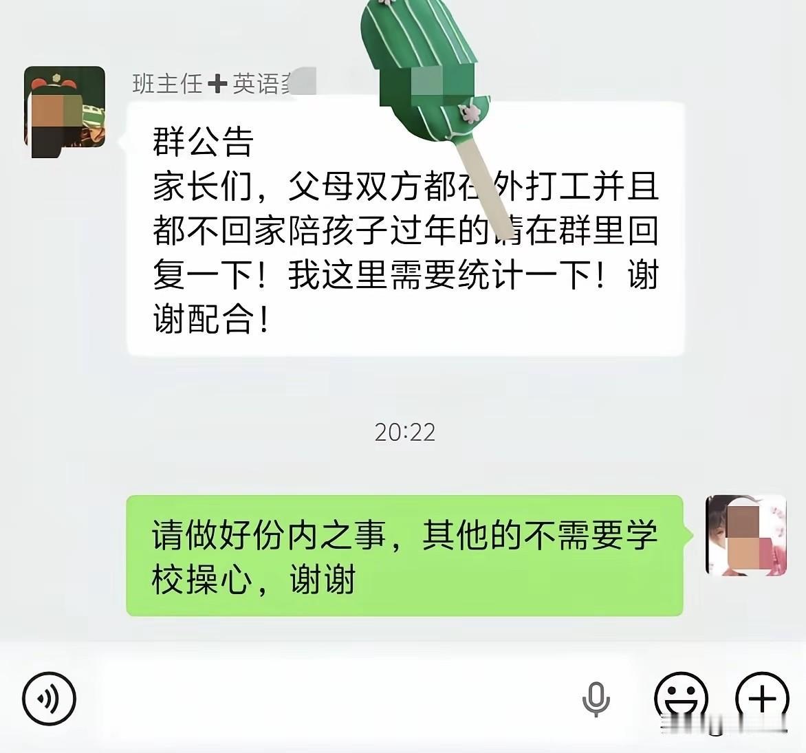 这位家长真是让老师寒心啊!班主任本是好心,在群里发布消息统计父母双方都在外务工且都不回家陪孩子过年的人数有多少,结果立马就遭到一位家长的怒怼,指责班主任咸吃萝卜淡操心,让老师做好分内之事即可。作为旁人,看到这段话,都觉得很寒心,现在的老师真不易,对于管也不是,不管也不是,属实难啊…..#寻美三湘# #长沙新朋友#