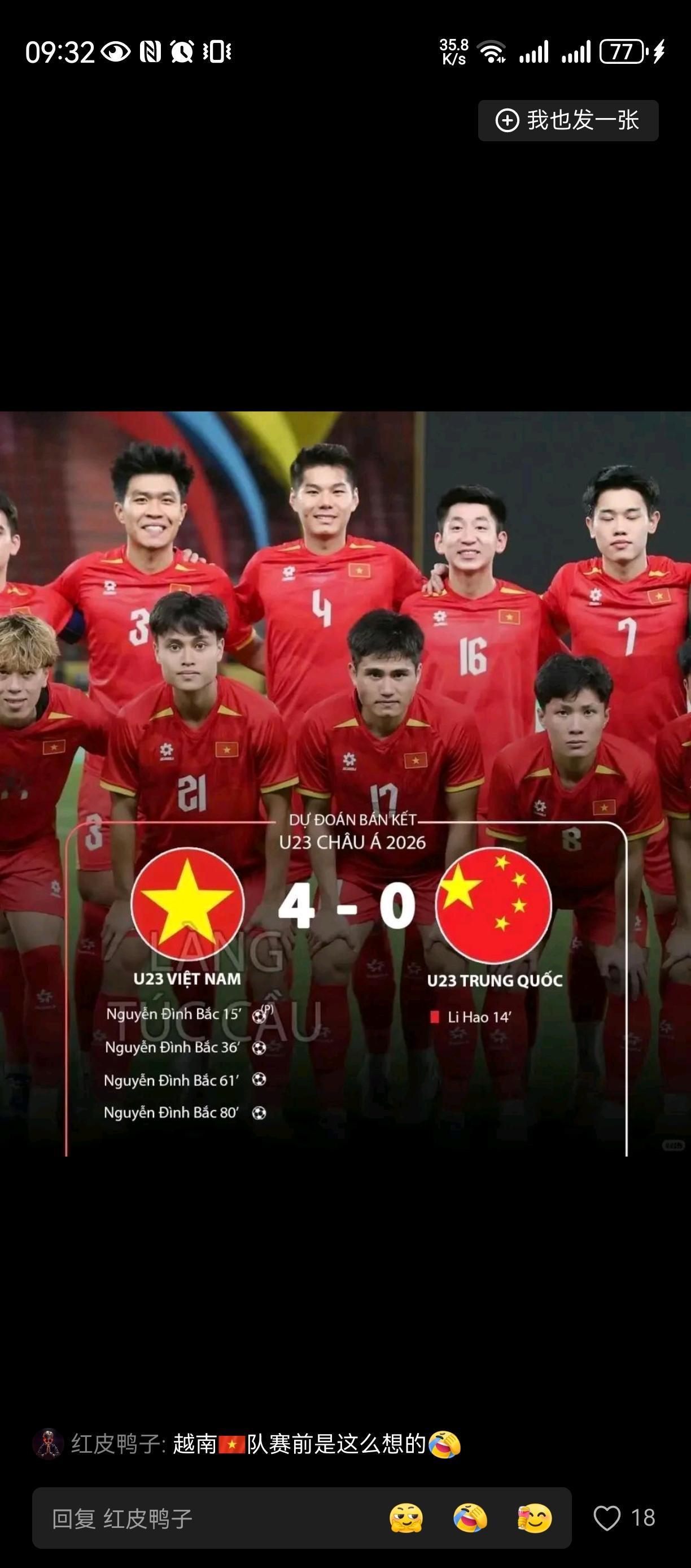 给各种苏湘疆各种超点赞[赞][赞][赞] 计划有变,支楞起来了[捂脸][捂脸][捂脸] 越南同志都要普天同庆, 准备在其党代会期间放一个大鞭炮🧨, 结果计划有变[捂脸] 球员打人,球员重伤,还被狂虐。。。 我们计划也有变, 从只防守到主动进攻, 把小越整不会了。。。 尤其我们全部是本土球员, 而越南有很多归化球员! 说明苏超等有点用[赞][赞][赞]