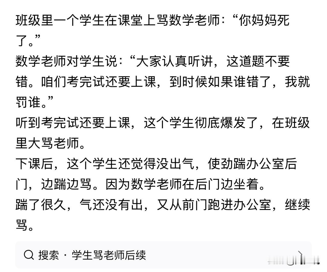 这位熊孩子真是“欠揍!”课堂上先是当众公然辱骂数学老师,下课后仍不解气,他跑到办公室后门猛踹,只因老师就坐在后门旁,踹门之余还不停辱骂,毫无敬畏之心。 幸亏这位数学老师很冷静,没有被这位熊孩子的举动所激化,要不然后果真是不敢想象,到时家长又把老师当摇钱树了。 当然,这事更暴露出当下部分学生教养缺失、规则意识淡薄的问题。师者,传道授业解惑,尊重师长是做人的基本准则,更是刻在骨子里的教养。 这位熊孩子因一己不满就肆意辱骂、冲撞老师,既违背了校园规则,也折射出家庭教育的缺位。作为家长,有着不可推卸的责任。 总之,校园不是法外之地,任性妄为终要为自己的行为买单,尊重与敬畏,才是孩子成长路上最该学好的一堂课。#寻美三湘# #长沙新朋友#