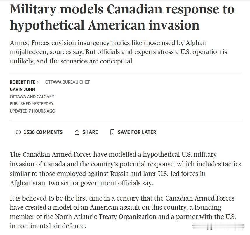 加拿大《环球邮报》:军方拟制美国入侵应对方案,美加战略关系生变 加拿大全国性媒体《环球邮报》报道称,加拿大军方正在草拟美国入侵加拿大的可能情景及抵抗战略(报道链接见下文)。尽管报道强调,美国入侵加拿大的可能性仍较低,此项研究也仅是一个概念性模型,而非实际作战计划,但这一举措仍表明,美国对加拿大而言,已从昔日紧密的战略伙伴,转变为需要防范的对象。 该模型假设美国从加拿大南部发起入侵。加拿大军方认为,本国部队兵力不足,武器装备也无法与美军抗衡,但加拿大可采取游击战策略,通过设置陷阱与炸弹,持续伏击美军,造成其重大伤亡,让美国付出高昂代价——这一战略与阿富汗战争时期塔利班采用的手段极为相似。此外,加拿大军方同时也模拟了中国与俄罗斯攻击加拿大的情景。 (题外话:美国首都唯一一次沦陷、白宫被焚毁,正是英国与加拿大军队所为。美国独立战争结束后,美英军事对峙仍持续多年。1812年,英国正与法国交战,美国认为这是难得的机会,意图一举入侵当时尚为英国殖民地的加拿大,将英国势力彻底逐出北美洲,以确保美国的永久安全。 于是,美国在准备不足的情况下仓促出兵,此次冲突史称“美加战争”。战争持续两年多,战线从北美洲一直延伸至大西洋。然而,美国未曾料到,英国后来迅速击败法国,将大军调回加拿大;加拿大民兵及多个原住民部落也无意与美国合作,反而倒向英国。随后,英加联军一路南下,攻占华盛顿特区,最终纵火焚毁了白宫。)