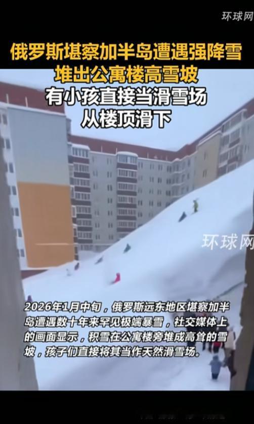 真不愧是战斗民族啊,一场数十年不遇的暴雪直接把城市给“焊”在了雪里,但俄罗斯人居然把高楼当成滑雪场,小孩直接从楼顶往下滑。 最近俄罗斯堪察加半岛的暴雪,算是把“极端天气”四个字具象化了,这场号称146年一遇的大雪,从1月12号开始就没松过劲,硬生生把整座城市裹进了厚厚的雪壳里,说把城市“焊”在雪里一点不夸张。 街上的汽车全被埋成了“白色馒头”,只露个天线勉强辨认位置,低层门窗直接被雪封死,居民一开门,积雪就跟瀑布似的往楼道里灌。 最绝的是风口地带,狂风把雪往建筑背风处堆,硬生生堆出了近十几米高的雪坡,快赶上四五层楼的高度,这就给后续的“硬核玩雪”埋下了伏笔。 不少网友刷到的小孩从高楼往下滑的视频,确实是当地真实场景,说白了就是天然形成的大雪坡靠着居民楼,成了孩子们的临时滑雪场,有的甚至坐着脸盆、简易滑板从天台附近往下冲,欢笑声隔着屏幕都能感受到。 不光小孩,还有成年人图方便,从五六楼阳台直接跳进松软雪堆里出门,有个要去医院照顾家人的男子,跳完拍了拍雪就走,毫发无伤的视频还火了。 但别光觉得战斗民族会玩,背后的风险一点不少,当地已经有人因为跳窗玩雪摔成脚踝骨折,官方也一个劲警告,积雪底下可能藏着冰缝、井盖,看着软乎乎的雪堆,实则暗藏危机。 这场雪根本不是浪漫的雪景,而是实打实的灾害——城市宣布进入紧急状态,学校停课、交通瘫痪,还有人因为屋顶积雪滑落丧生。 这么说吧,所谓的“玩雪”,一半是乐观心态,一半是无奈之举,暴雪压得铲雪车寸步难行,清理出的道路转眼就被新雪覆盖,居民被困在家中,只能自己想办法找乐子、谋出路。 当地甚至调来了囚车当免费公交,靠着高底盘在积雪里穿梭,接送居民去医院、超市,也算绝境里的灵活应对。 专家也说了,这次的大雪不是单纯的降雪,是风吹雪的堆积效应加上全球气候异常导致的。 北极变暖打乱了大气环流,让冷空气和暖湿气流在高纬度地区猛烈碰撞,才造出了这场百年一遇的灾害。 这几年极端天气越来越频繁,堪察加的降雪量也一次次刷新纪录,早就不是偶然现象了。 视频里的嬉闹背后,是超市物资涨价、部分区域断电断水的现实,志愿者们深一脚浅一脚地运送药品,医护人员徒步穿梭在齐胸深的雪里救人。 战斗民族的乐观确实动人,但这场暴雪更像一次体检,照出了城市基建在极端天气下的短板,也提醒着大家,极端气候常态化后,我们要面对的挑战还很多,雪停之后,清理、修复和反思,才是更重要的事。