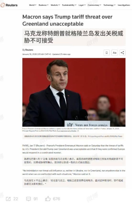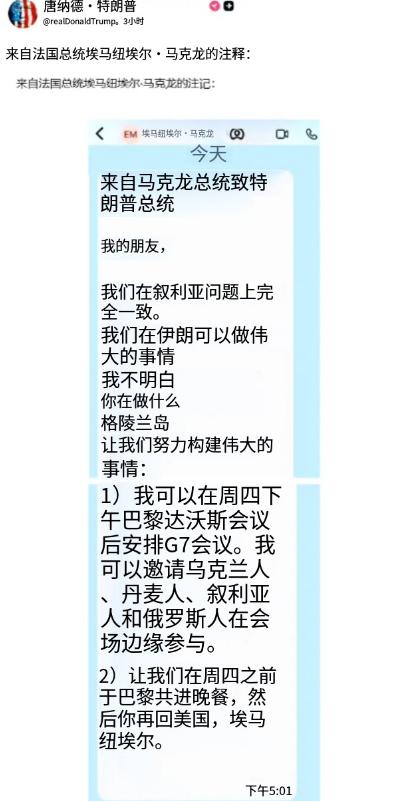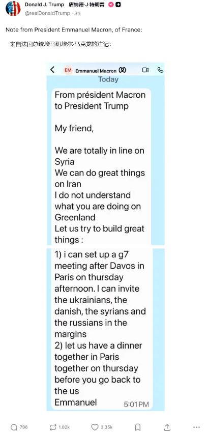 美国总统老特把法国总统马克龙发给他的私信给公开到网上了,扒掉了马克龙伪君子的面具。 最近国际上又出了件撕破脸的事,美国总统老特直接把法国总统马克龙发给他的私信晒到了社交平台上,一下就让马克龙的处境变得十分尴尬,所谓的“伪君子”面具算是被扒得明明白白。 这事说起来也不算突发,根源还是老特牵头搞的那个“和平委员会”,马克龙明确拒绝加入这个委员会,理由是觉得它超出了原本的议题范围,还可能削弱联合国的地位,这显然戳中了老特的不满。 转头老特就来了个狠的,不仅在社交媒体上炮轰马克龙,还直接放出了两人的私信截图,一点情面都没留。 从公开的私信内容来看,马克龙倒是显得挺热络,既称老特为“我的朋友”,说双方在叙利亚问题上“完全一致”,还提议22号在巴黎办一场G7紧急会议,邀请乌克兰、俄罗斯等国参会,会后再和老特共进晚餐。 可同时他又在短信里直言,“无法理解你在格陵兰岛问题上的所作所为”,一边示好一边质疑的姿态暴露无遗,法国方面已经证实了这条短信的真实性,算是坐实了这份“双面沟通”。 老特这波操作可不只是泄愤,还跟着放了狠话,被问起马克龙拒绝加入委员会的事,他直言“没人愿意搭理他,因为他很快就要下台了”,还威胁要对法国葡萄酒和香槟征收200%的关税,逼着马克龙妥协。 要知道美国是法国葡萄酒最大的海外市场,这一手直接打在了法国的经济痛点上。 这么说吧,老特公开私信的举动,本质就是用最直接的方式施压报复,他向来不按常理出牌,之前也曝光过和其他欧洲领导人的私信,根本不在乎所谓的外交默契。 而马克龙这边,原本想在私下协调立场、兼顾各方,结果被当众拆台,既丢了面子,又让欧洲盟友对其产生了信任顾虑。 这事还不止影响美法关系,更让跨大西洋盟友间的裂痕越来越明显,欧洲各国本就对老特的单边主义不满,这次公开私信的行为,更是破坏了外交沟通的信任基础,以后恐怕没哪个欧洲领导人敢和老特推心置腹了。 而且老特的关税威胁一旦落地,欧盟大概率会启动反制,贸易摩擦只会越演越烈。 说到底,这就是一场利益主导的外交博弈,老特想靠强硬手段逼迫盟友妥协,巩固自己的主导地位,而马克龙的“两面姿态”被戳穿后,只能硬着头皮坚持立场。 后续达沃斯论坛上,两人会不会正面交锋,美法关系又会走向何方,还得接着看局势发展。