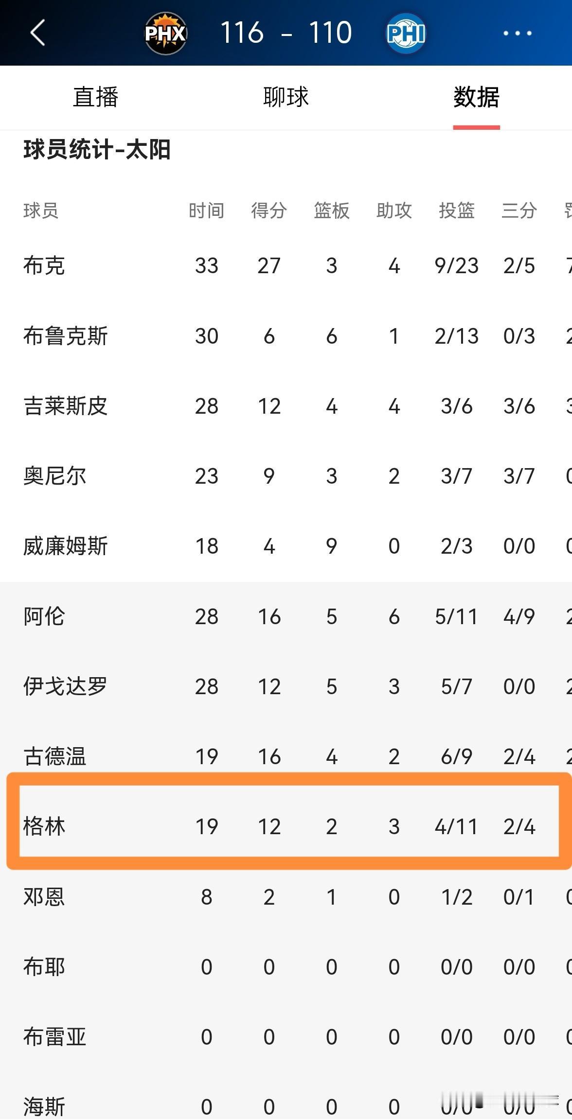 我必须要好好夸夸太阳球星杰伦-格林!在今天太阳客场以116:110击败76人的比赛中,因伤缺阵多日的杰伦-格林终于回归球场,他在替补出战的19分钟里,投篮11中4,其中三分球4中2、罚球2中2得到12分,还有2篮板3助攻,他的场上正负值为+10。 虽然杰伦-格林还没有恢复到自己的最佳状态,但是他的突破和三分球依然非常犀利,此外格林也愿意在防守端投入更多的精力了。