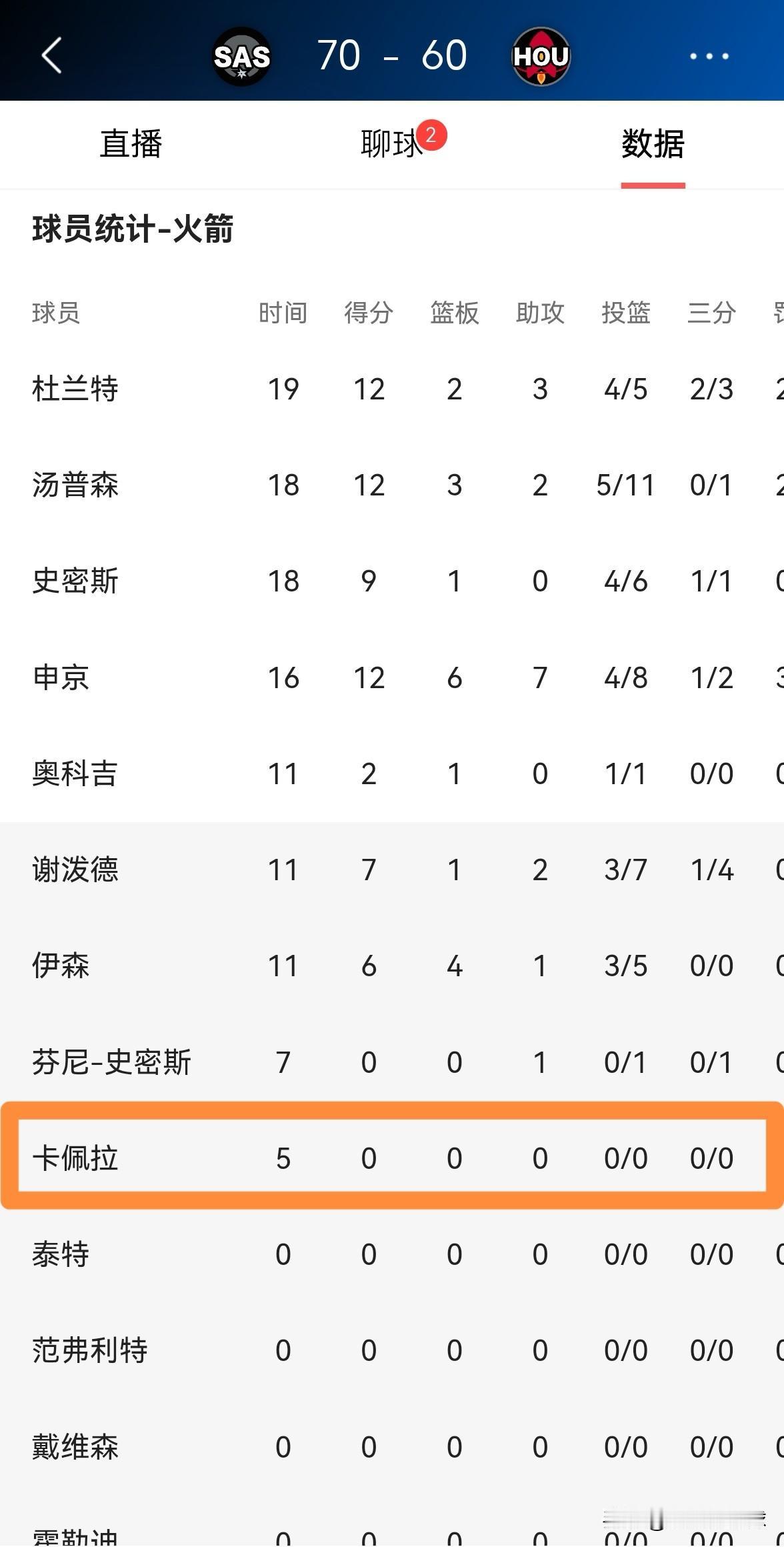 火箭中锋卡佩拉真是毫无用处!在今天火箭主场迎战马刺的比赛中,目前双方半场战罢,火箭以60:70落后于对手。在前两节比赛中,卡佩拉替补出战5分钟,没有出手怒砍0分0篮板0助攻0抢断,他的场上正负值为-7。 老实说,在前两节比赛中卡佩拉在攻防两端都毫无用处,他完全就是球队的累赘,作为一名中锋,卡佩拉的篮板数竟然是0。