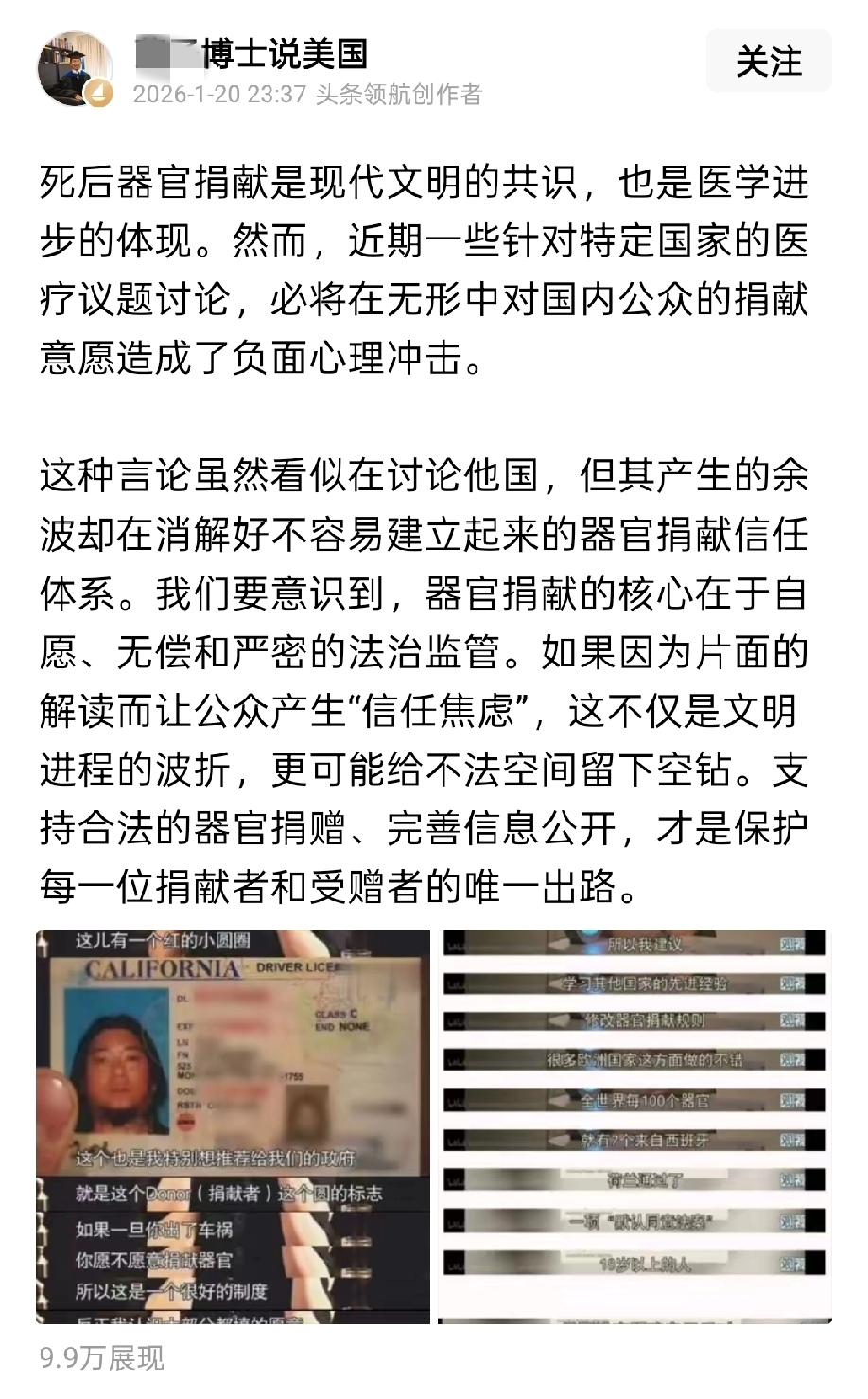 急了、又急一个!牢A警告去美国千万不要勾选器官捐赠,针对牢A的劝诫,有位蔡公知夜不能寐,终于给牢A扣上大帽子:你这种言行会对国内公众器官捐赠造成负面心理冲击! 啊,怎么感觉牢A把蔡公知搞失智了啊,这逻辑也不对啊。 的确,死后自愿器官捐献是现代文明的共识,这种无私和奉献小我、成就大我的精神推动了医学的发展,非常值得推崇和学习。 但是牢A揭露的是美国利用这个文明的规则,干野蛮的事、干缺德的事。器官捐赠重点是自愿、无偿、严密的法治监管,试问一下,按照牢A的爆料,美国的器官捐赠都做到了这三点吗? 网友的评论很扎心:“捐的无偿,用的有偿,疯狂的是赚差价的中间商。”“你鼓吹的是公益、是文明,但是美丽软却把他当利益、当产业” 蔡公知这波属实是偷换概念、避重就轻了!牢A质疑的从来不是器官捐赠本身,而是美国器官捐献链条里藏着的猫腻和黑幕。 一边喊着文明公益的口号,一边放任中间商赚得盆满钵满,这种双标操作,难怪网友直呼“挂羊头卖狗肉”!