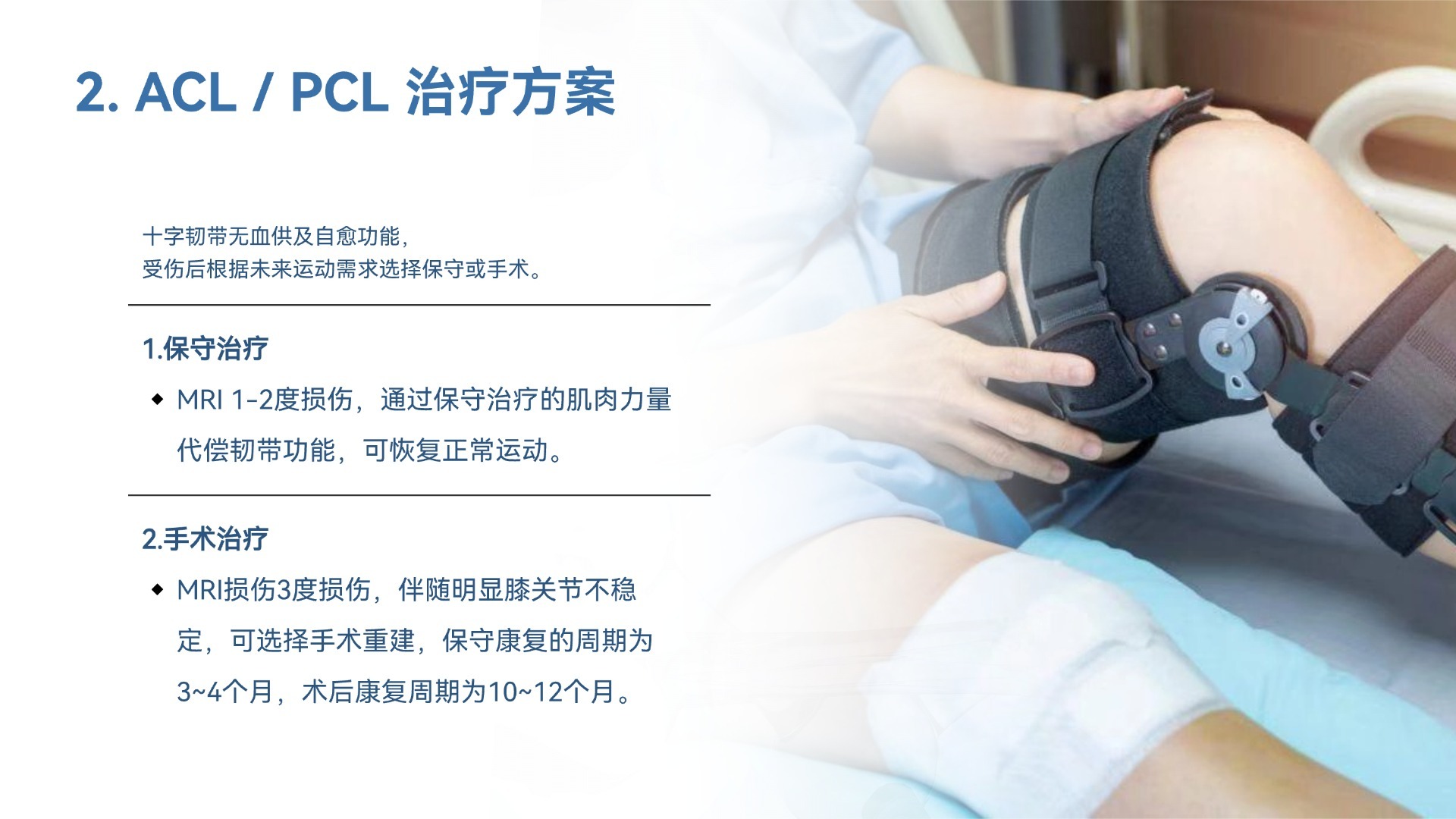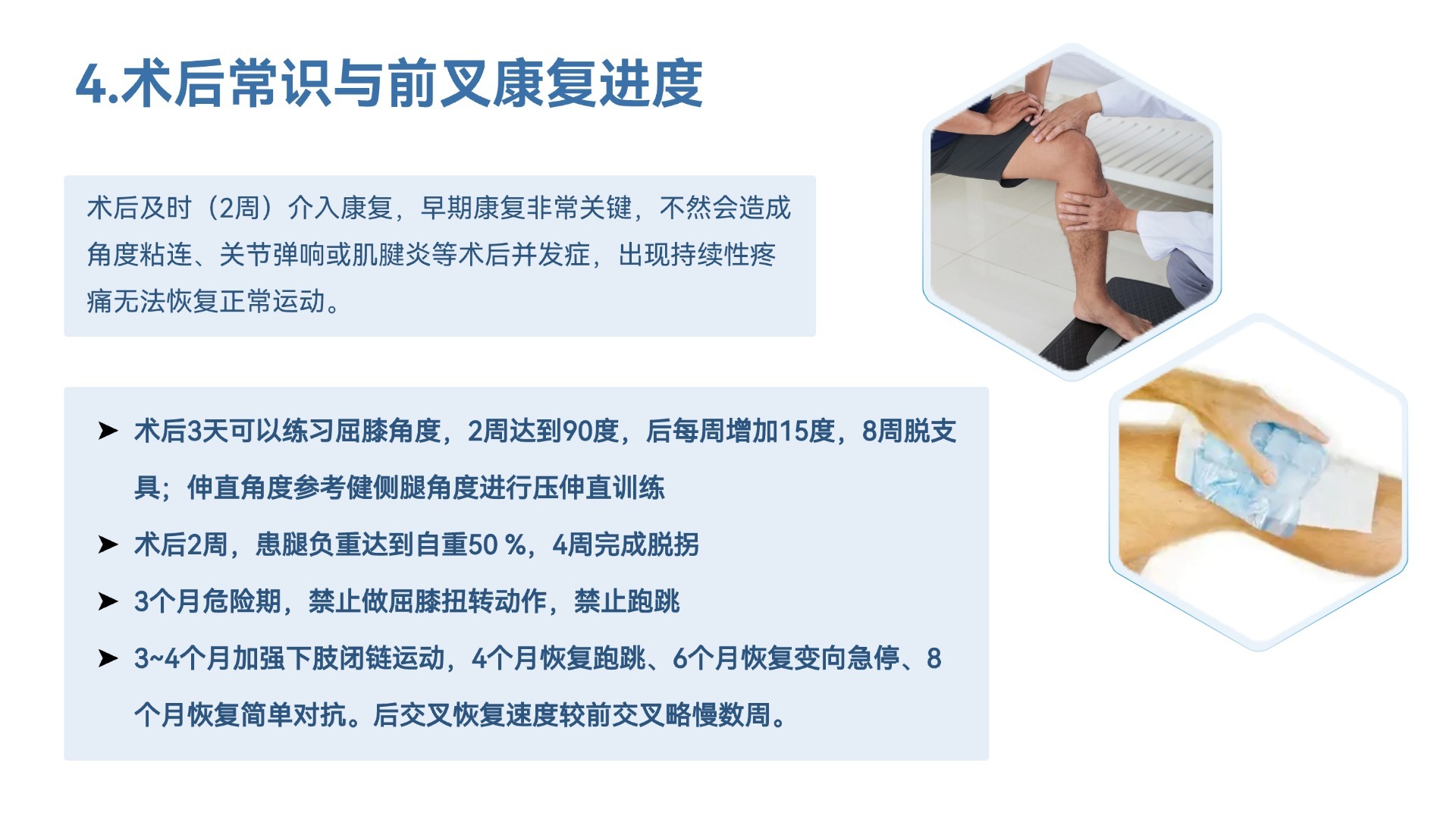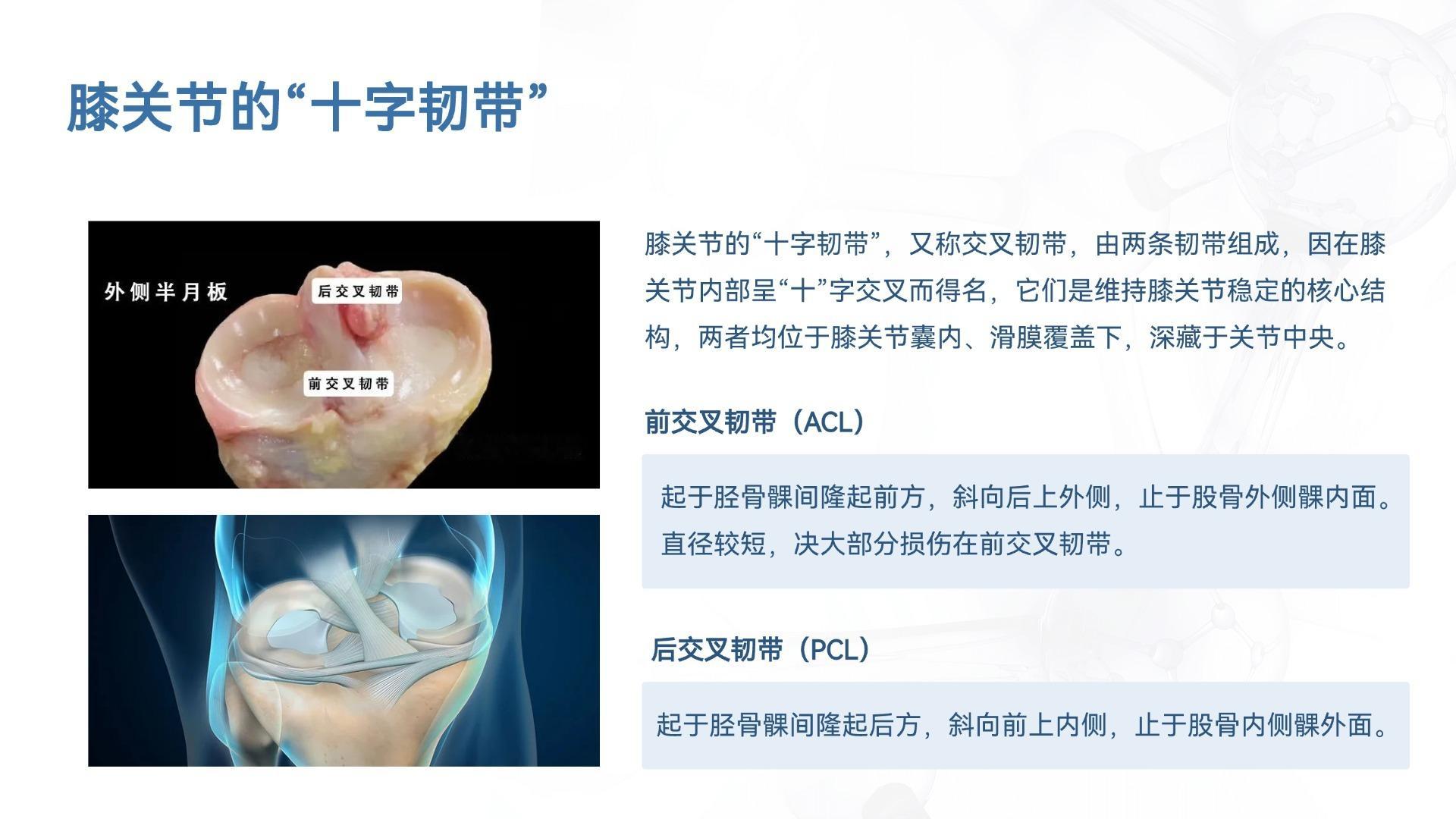 前叉韧带重建 看到“巴特勒前十字韧带撕裂”的消息,这个损伤大家很熟悉了,今天我们就来讲讲膝盖的“十字韧带”,以及术后康复的要点——膝关节的“十字韧带”,又称交叉韧带,由两条韧带组成,前交叉韧带和后交叉韧带,因在膝关节内部呈“十”字交叉而得名,它们是维持膝关节稳定的核心结构。【韧带损伤】图31. 疼痛症状:膝盖不稳、大小腿分离感、无力感,会伴随膝盖内侧半月板或内侧副韧带损伤疼痛2,疼痛诱发场景:绝大部分情况,韧带损伤后膝关节没有明显痛感,损伤后会有大量关节积液,存在胀痛,如果内侧疼痛怀疑内侧副韧带合并损伤。损伤后会有大量关节积液。3,高风险损伤动作:常见于膝关节内扣并伴随蹬伸动作,例如:在羽毛球上步接球、篮球对抗落地、足球高速变向等动作中出现膝内扣并蹬伸。4. 损伤发展风险:正常韧带无血供、撕裂无疼痛,如果伴随明显痛感,可能会有半月板和软骨损伤;前交叉一旦损伤无法自愈,并伴随膝关节不稳,容易继发骨关节炎,需要强化肌肉代替韧带能力。【ACL 影像学分型】图4-6Ⅰ级:韧带完整,轻度损伤Ⅱ级:部分撕裂Ⅲ级:完全断裂【ACL PCL 治疗方案】图7-8十字韧带无血供及自愈功能,受伤后根据未来运动需求选择保守或手术。【基础术后常识】图91、术后及时(2周)介入康复,早期康复非常关键,不然会造成角度粘连、关节弹响或肌腱炎等术后并发症,出现持续性疼痛无法恢复正常运动。2、前叉康复进度:术后3天可以练习屈膝角度,2周达到90度,后每周增加15度,8周脱支具;伸直角度参考健侧腿角度进行压伸直训练术后2周,患腿负重达到自重50 %,4周完成脱拐3个月危险期,禁止做屈膝扭转动作,禁止跑跳3~4个月加强下肢闭链运动,4个月恢复跑跳、6个月恢复变向急停、8个月恢复简单对抗。后交叉恢复速度较前交叉略慢数周。大家对于前叉或者后叉损伤还有哪些问题,可以下方来留言提问锐博康复 巴特勒前十字韧带撕裂