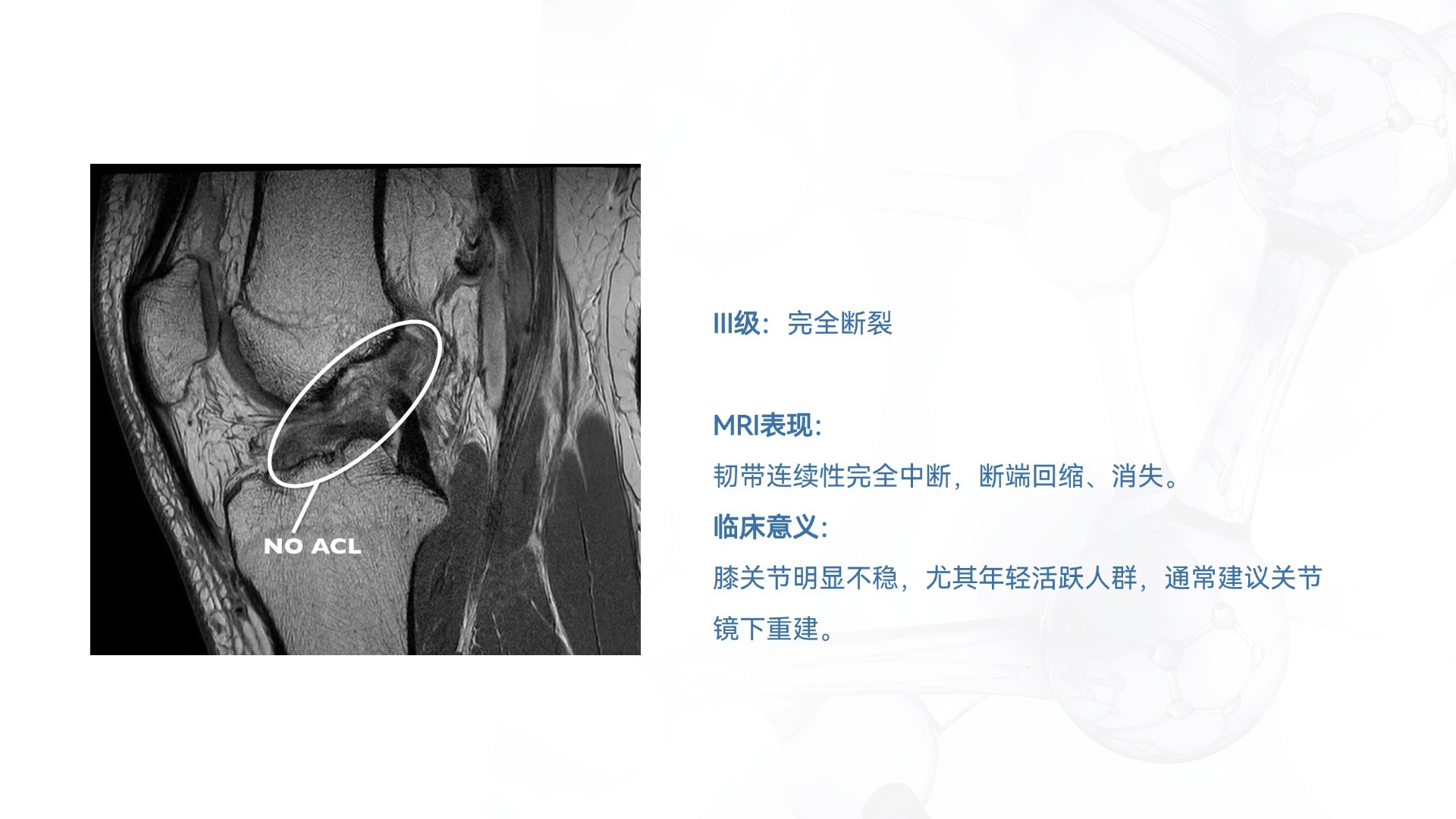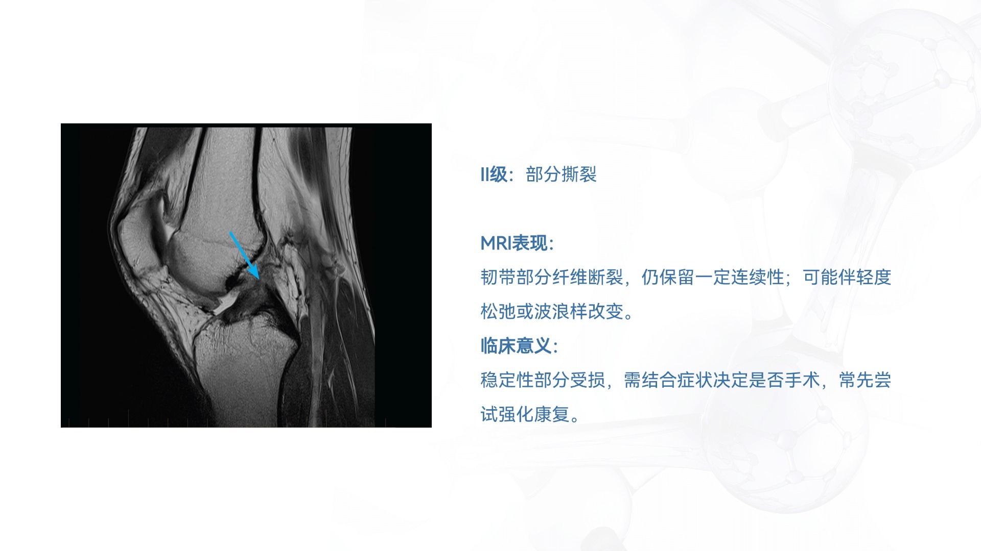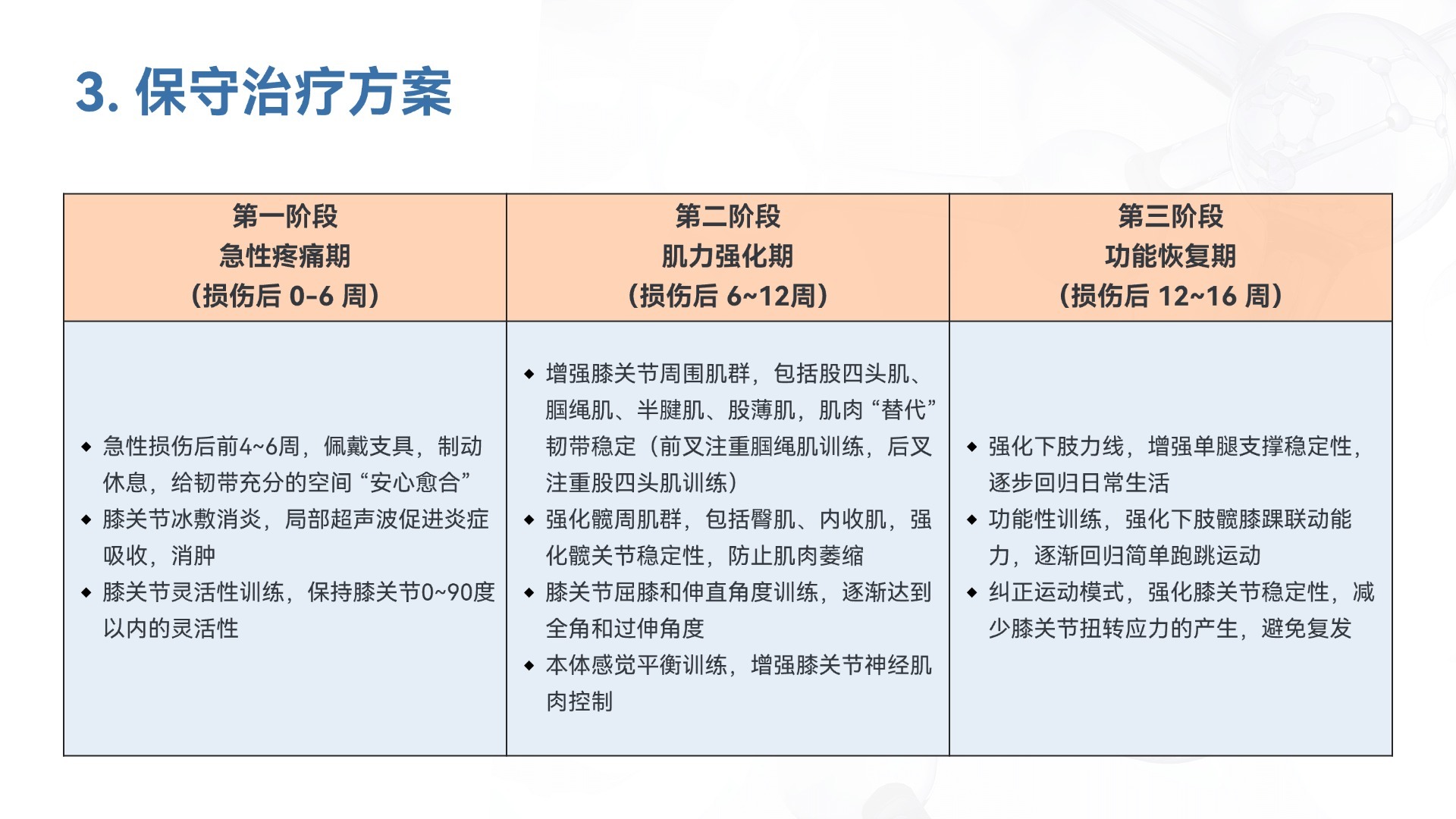 前叉韧带重建 看到“巴特勒前十字韧带撕裂”的消息,这个损伤大家很熟悉了,今天我们就来讲讲膝盖的“十字韧带”,以及术后康复的要点——膝关节的“十字韧带”,又称交叉韧带,由两条韧带组成,前交叉韧带和后交叉韧带,因在膝关节内部呈“十”字交叉而得名,它们是维持膝关节稳定的核心结构。【韧带损伤】图31. 疼痛症状:膝盖不稳、大小腿分离感、无力感,会伴随膝盖内侧半月板或内侧副韧带损伤疼痛2,疼痛诱发场景:绝大部分情况,韧带损伤后膝关节没有明显痛感,损伤后会有大量关节积液,存在胀痛,如果内侧疼痛怀疑内侧副韧带合并损伤。损伤后会有大量关节积液。3,高风险损伤动作:常见于膝关节内扣并伴随蹬伸动作,例如:在羽毛球上步接球、篮球对抗落地、足球高速变向等动作中出现膝内扣并蹬伸。4. 损伤发展风险:正常韧带无血供、撕裂无疼痛,如果伴随明显痛感,可能会有半月板和软骨损伤;前交叉一旦损伤无法自愈,并伴随膝关节不稳,容易继发骨关节炎,需要强化肌肉代替韧带能力。【ACL 影像学分型】图4-6Ⅰ级:韧带完整,轻度损伤Ⅱ级:部分撕裂Ⅲ级:完全断裂【ACL PCL 治疗方案】图7-8十字韧带无血供及自愈功能,受伤后根据未来运动需求选择保守或手术。【基础术后常识】图91、术后及时(2周)介入康复,早期康复非常关键,不然会造成角度粘连、关节弹响或肌腱炎等术后并发症,出现持续性疼痛无法恢复正常运动。2、前叉康复进度:术后3天可以练习屈膝角度,2周达到90度,后每周增加15度,8周脱支具;伸直角度参考健侧腿角度进行压伸直训练术后2周,患腿负重达到自重50 %,4周完成脱拐3个月危险期,禁止做屈膝扭转动作,禁止跑跳3~4个月加强下肢闭链运动,4个月恢复跑跳、6个月恢复变向急停、8个月恢复简单对抗。后交叉恢复速度较前交叉略慢数周。大家对于前叉或者后叉损伤还有哪些问题,可以下方来留言提问锐博康复 巴特勒前十字韧带撕裂