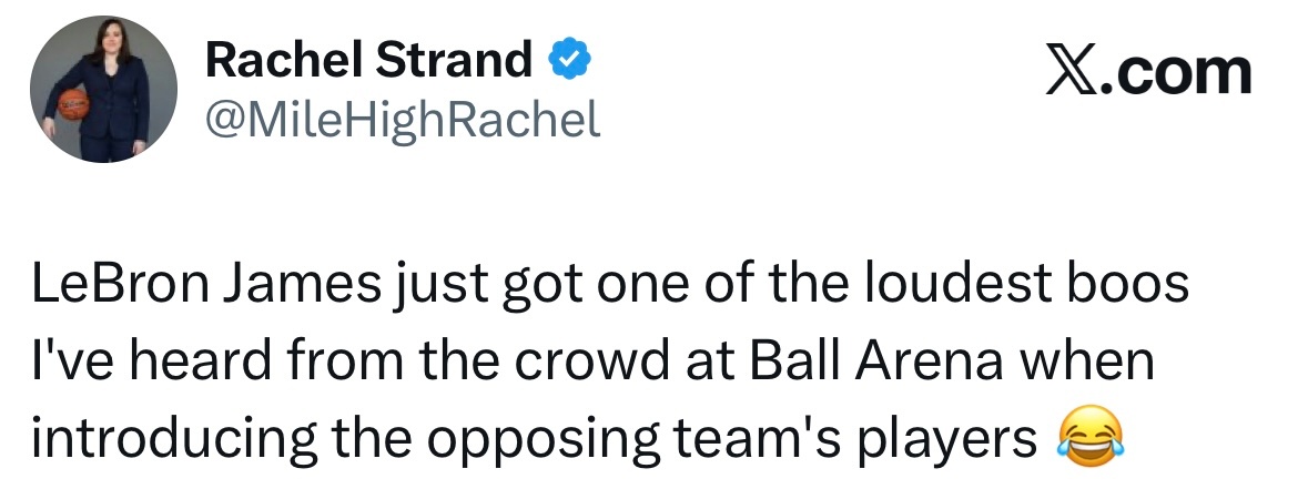 掘金记者:在介绍客队球员时,詹姆斯在球馆收获了我听过的最响亮的嘘声之一。
