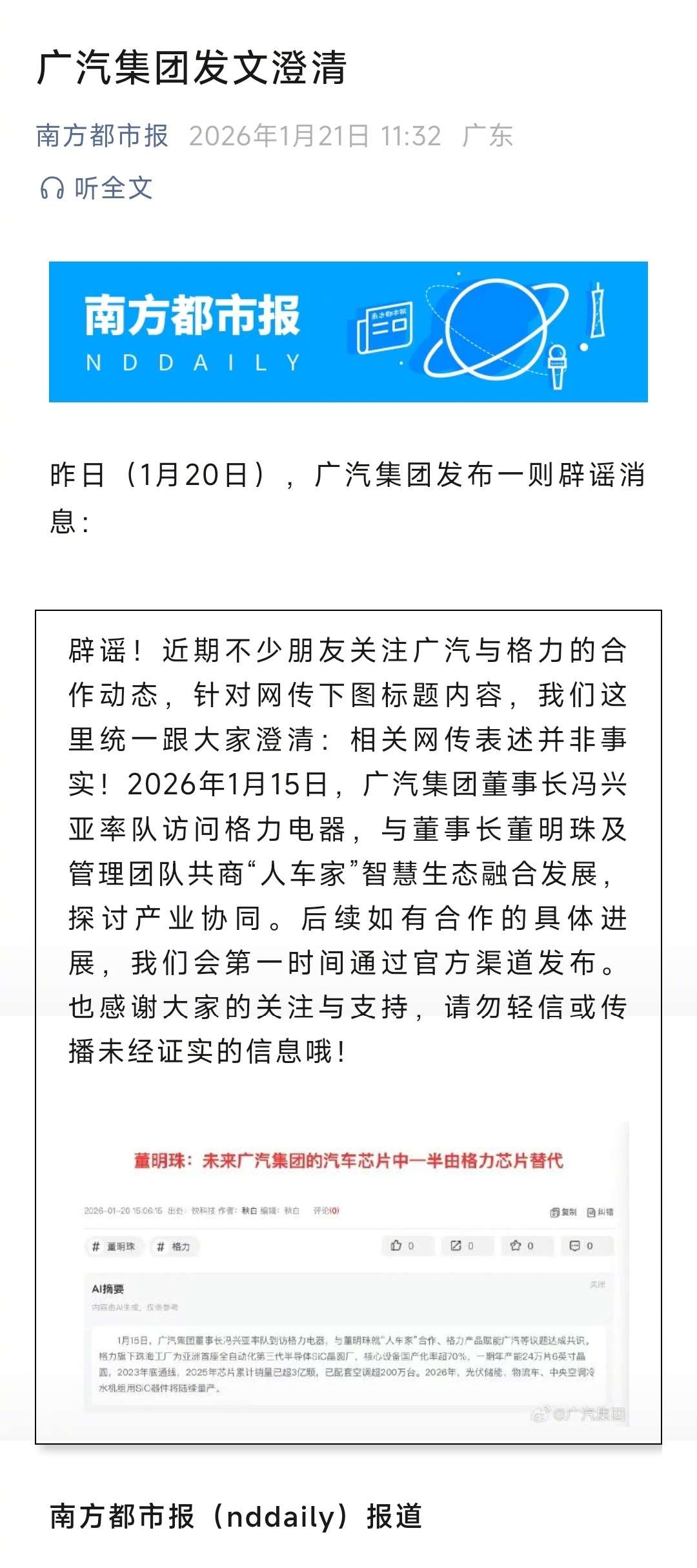#广汽辟谣未来一半汽车用格力芯片#【广汽集团发文澄清】#广汽澄清与格力合作#1月20日,广汽集团发布一则辟谣消息:辟谣!近期不少朋友关注广汽与格力的合作动态,针对网传下图标题内容,我们这里统一跟大家澄清:相关网传表述并非事实!2026年1月15日,广汽集团董事长冯兴亚率队访问格力电器,与董事长董明珠及管理团队共商“人车家”智慧生态融合发展,探讨产业协同。后续如有合作的具体进展,我们会第一时间通过官方渠道发布。也感谢大家的关注与支持,请勿轻信或传播未经证实的信息哦!