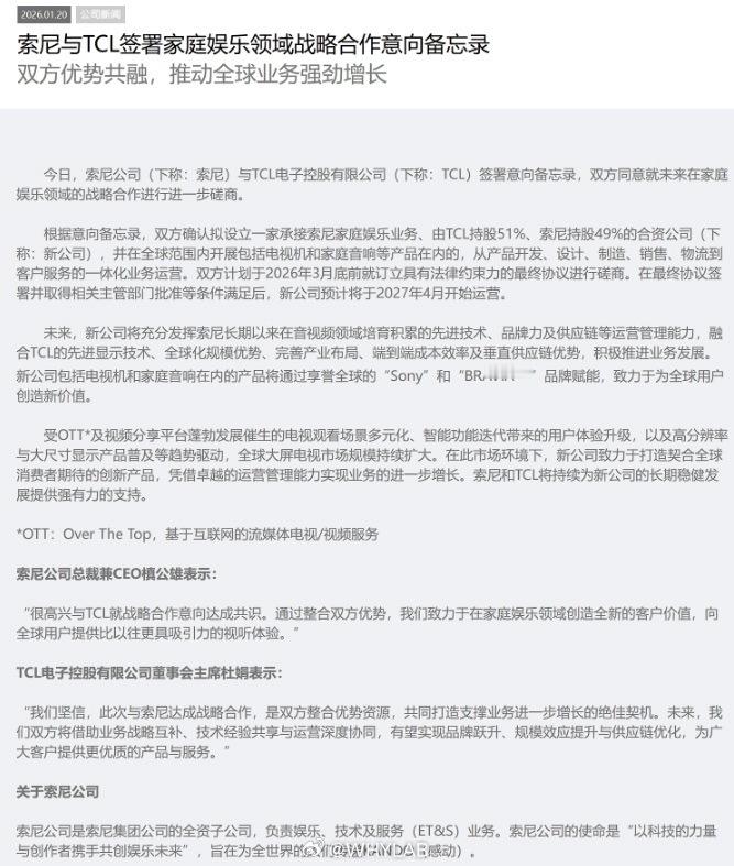 这下索尼大法再好也不管用了,索尼宣布剥离电视业务,和 TCL 成立合资公司,TCL 持股 51%,索尼持股 49%。新公司会把电视和家用音响的研发、设计、制造、销售、物流等环节全部整合,预计 2027 年 4 月正式运营。其实这也算是互补合作,TCL 可以借索尼的名号继续冲击高端市场,索尼则通过 TCL 华星剥离高成本制造环节,省下的钱又能投到游戏业务里去。如何看待索尼电视牵手TCL