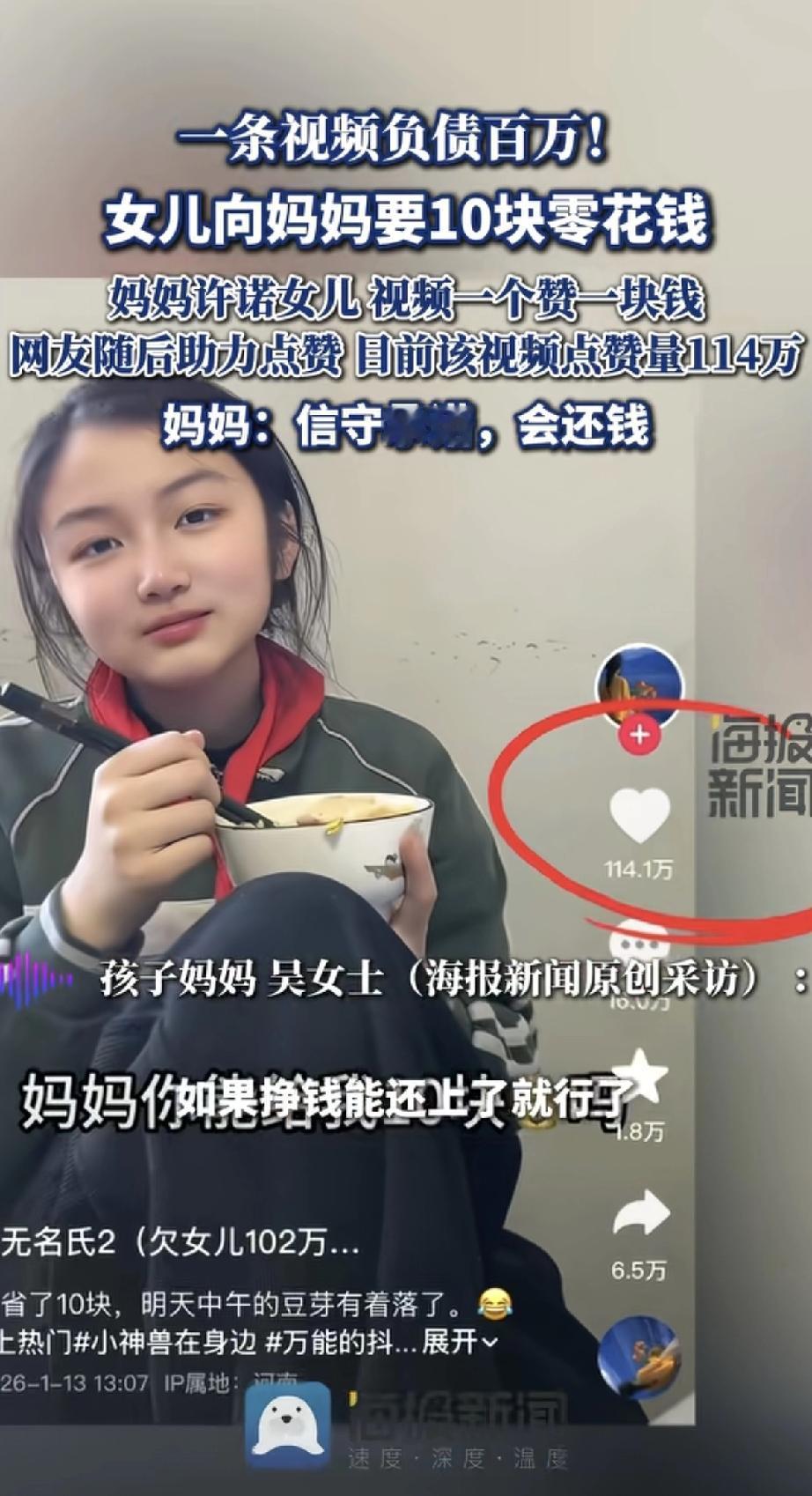 这届网友的“热心肠”,一个视频让一位妈妈“负债百万”! 事情是这样的:女儿想找妈妈要10块钱零花钱,妈妈灵机一动,开了个玩笑说:“我在网上发条视频,一个赞就给你一块钱!” 心想顶多也就几十个赞吧。 结果,视频一下子火了!网友们的“助攻”根本停不下来,点赞量直接冲到了114万。这下好了,玩笑开大了,妈妈瞬间“欠”了女儿一百多万! 虽然妈妈事后说会信守承诺,但明眼人都知道,这“债”肯定还不上啦。网友们也乐得不行:“省了10块,明天豆芽菜钱有了!” 这真是,一个玩笑引发的“百万债务 ”奇观。