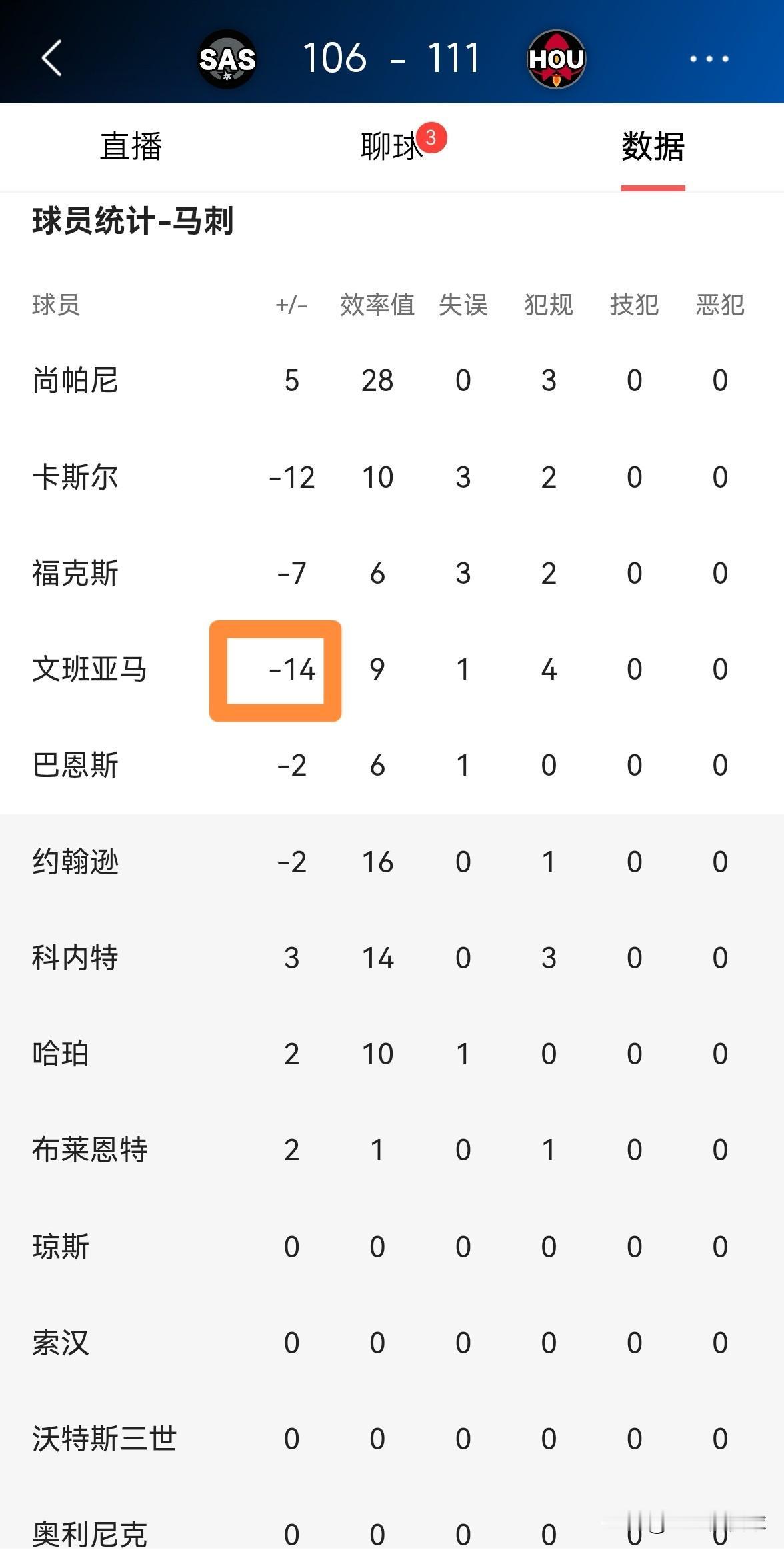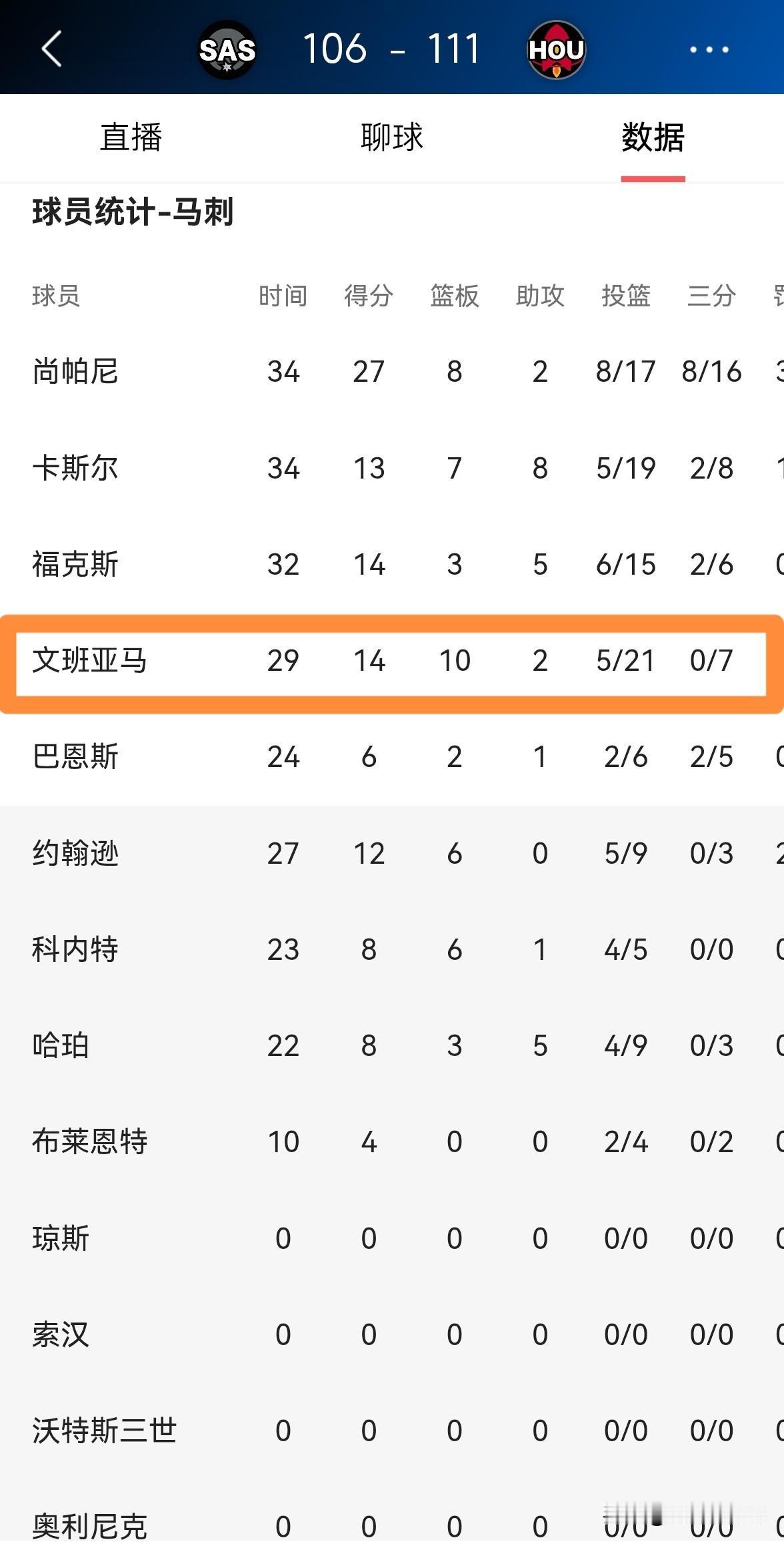 马刺当家球星文班亚马必须要为球队的失利背锅了!今天马刺在客场以106:111不敌火箭,其中文班亚马的表现简直就是一场灾难。整场比赛下来,文班亚马首发出战29分钟,投篮21中5,其中三分球7中0、罚球4中4极其低效的得到14分,还有4次犯规,他的场上正负值为-14。 尤其是在关键的第四节比赛中,文班亚马的表现简直是糟糕透顶,他在三分线外连续强投不中,导致球队彻底的失去了赢球的希望。