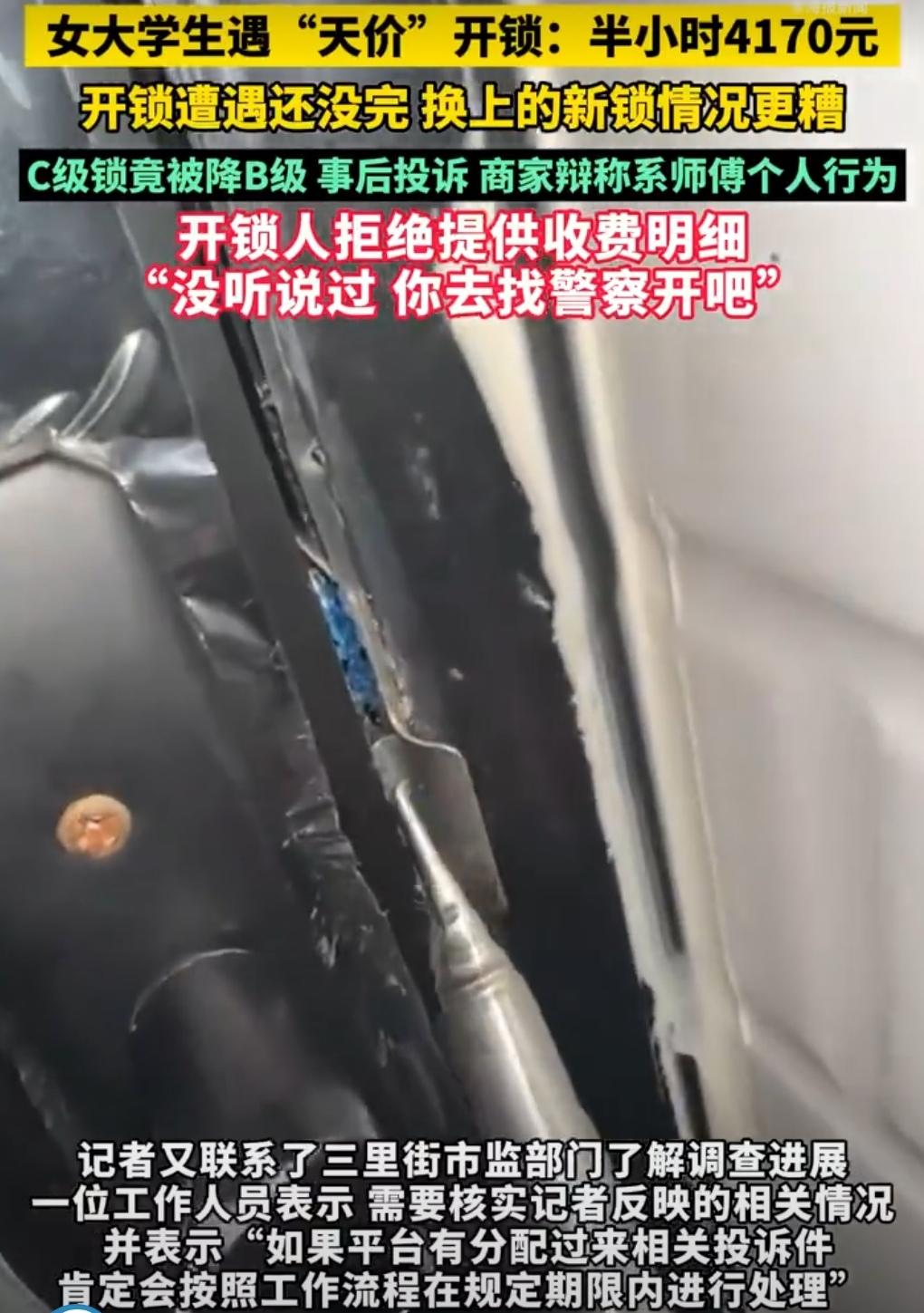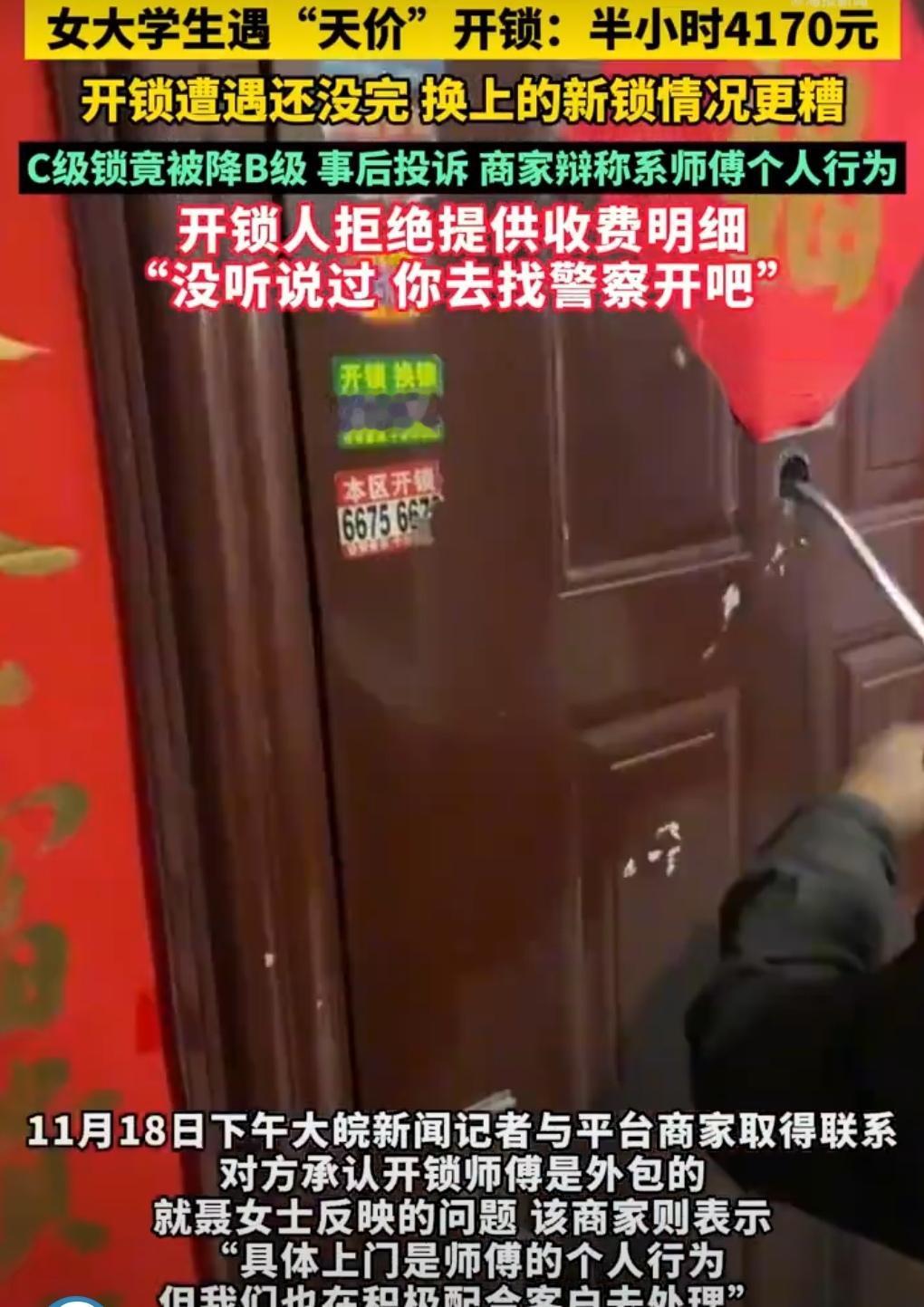 合肥的大学生聂女士,怕是怎么也想不到,一次普通的开锁经历,会变成一场“噩梦”。 11月14日傍晚,她下课回出租屋,发现钥匙被反锁屋内,便在美团平台预约了“即刻达开锁换锁”服务,平台标价仅27元 。 谁能料到,开锁师傅到场后,开启了连环收费模式。先是谎称聂女士的A级门锁是C级锁,必须强拆,收了540元拆锁费。拆完又说锁体损坏,追加380元。 完工后,索要公司服务费600元以及安装费、强开费等1740元。都走了还折返,以夜间服务费为由再收900元。半小时内,收费高达4170元!这还不算完,师傅还要求聂女士录制“自愿付费”视频,面对索要收费明细的要求,竟嚣张回应“没听说过,找警察开吧”。 这哪里是正常开锁,分明是明目张胆的宰客!商家利用消费者的急切与信息差,虚构锁具等级、随意加价,严重侵犯了消费者的知情权和公平交易权,涉嫌价格欺诈。 美团平台也难辞其咎,对商家监管不力,预约流程还绕过监管,给不良商家钻了空子。 这种“天价开锁”乱象不能再纵容。监管部门应加强对开锁行业的监管,规范收费标准;平台要切实履行审核和监管责任,别让消费者的信任打水漂;消费者自身也要多留个心眼,遇到不合理收费,及时留存证据维权。 只有各方共同努力,才能让此类乱象不再发生。