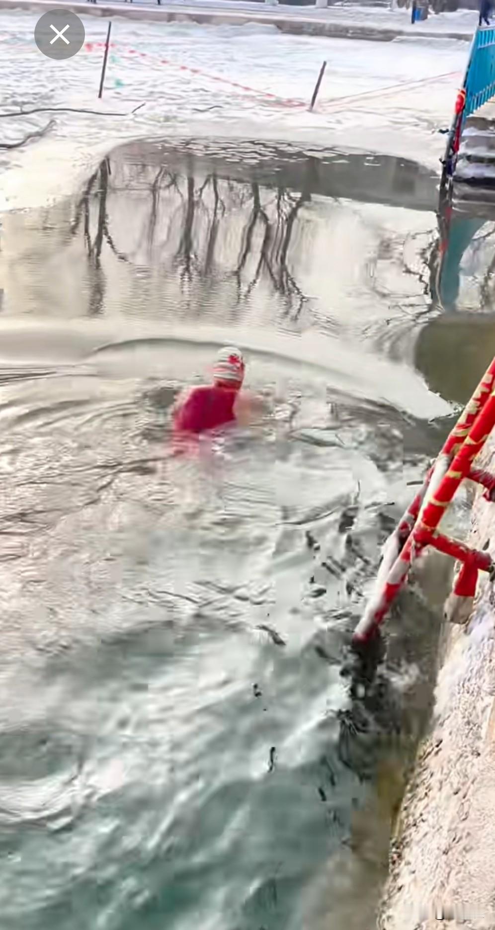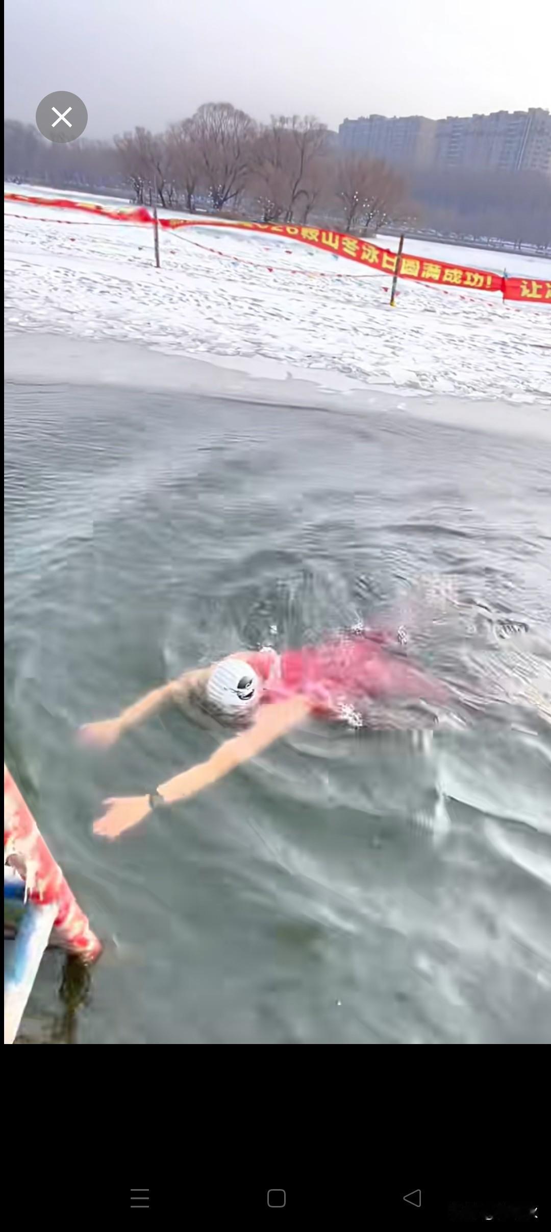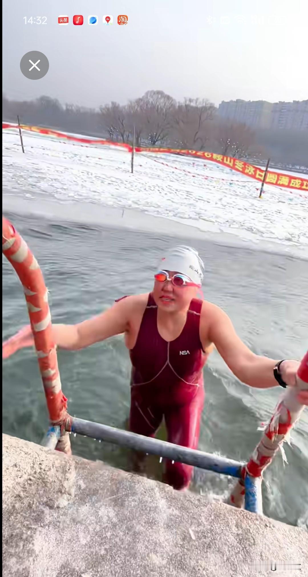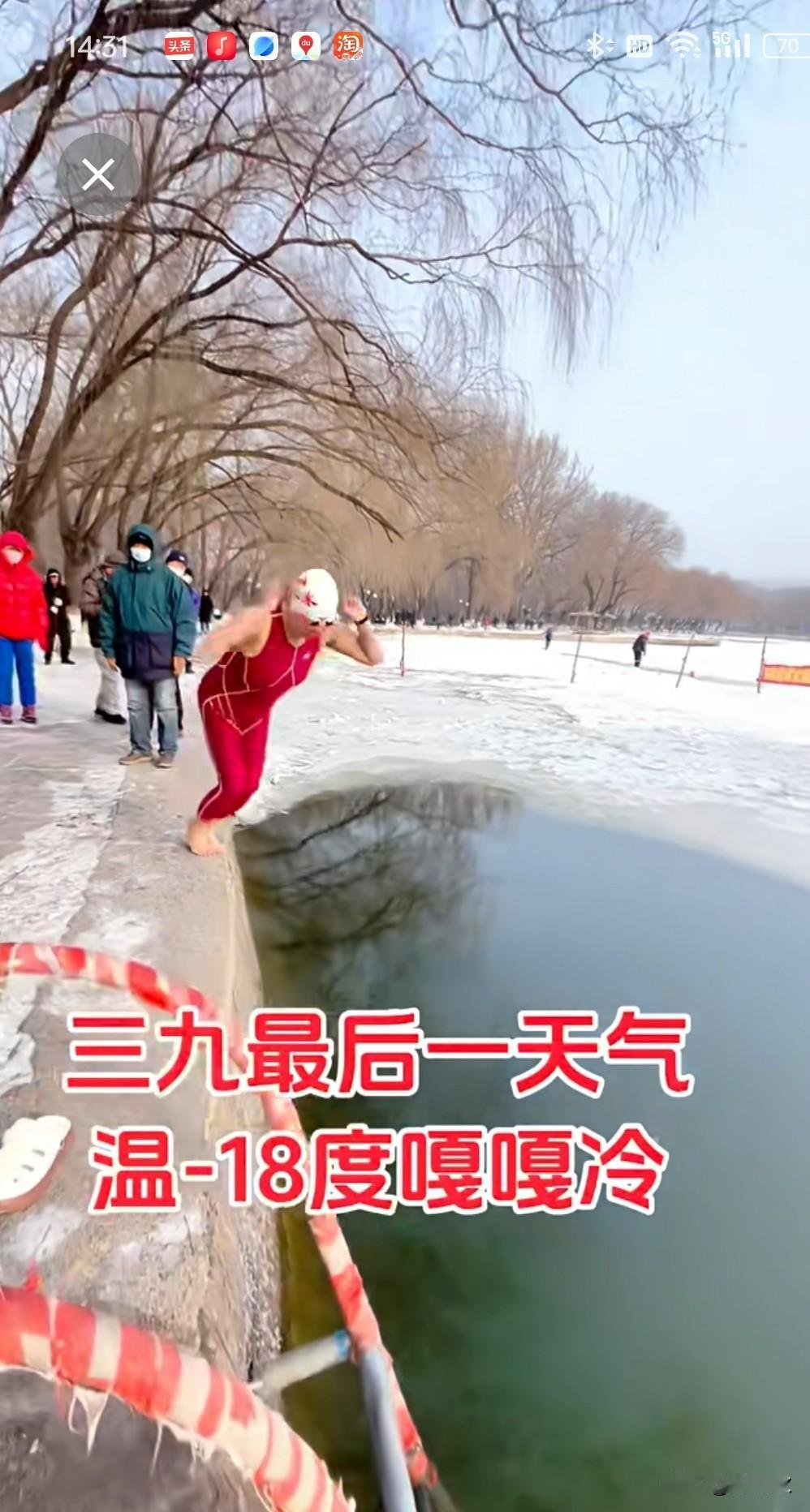 梅花欢喜漫天雪, 不畏寒冷冬泳者。