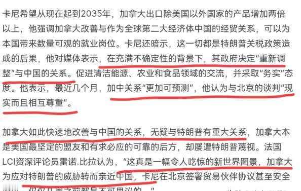 法媒对于加拿大与我们改善关系的幅度,深感惊讶!1月17日,法新社刊文表示,很难想象曾经一度陷入冰点的中加关系,竟然会迎来如此大的转折。而加拿大总理卡尼现在甚至形容中国为新战略伙伴关系,这让外界始料不及。法媒表示,直到卡尼总理出发前来北京时,加拿大官方还试图降低外界对此次访问成果的期待,称两国不太可能就化解一场贸易争端达成协议。 其实加拿大的“急转弯”说意外也不意外,核心原因卡尼自己都直言不讳:就是为了减少对美国的依赖。 长期以来,加拿大的经济和外交都被美国绑得死死的,美国既是它最大的贸易伙伴,也是它一直依赖的“安全靠山”。但最近几年,这份“依赖”越来越像负担,甚至变成了随时可能被拿捏的软肋。 根据加拿大统计局2026年1月的数据,2025年10月加拿大对美国的出口额还占总出口额的67.3%,虽然比往年有所下降,但这种单一市场依赖的风险已经越来越明显。 尤其是美国政策的不确定性,让加拿大彻底坐不住了,特朗普再次执政后,不仅频繁用关税大棒敲打包括加拿大在内的盟友,甚至抛出过将加拿大变为“第51州”的言论,这种无视盟友尊严的操作,无疑刺痛了加拿大对国家主权的敏感神经。 反观中国,不仅有庞大的市场容量,还和加拿大经济有着极强的互补性。加拿大有丰富的能源、农产品,中国有广阔的消费市场和完整的产业链,这种互补性在之前的贸易摩擦中被暂时掩盖,却从未消失。 之前加拿大跟着美国对中国电动汽车征收100%的惩罚性关税,中国也随之对加拿大油菜籽、豌豆等农产品加征关税,结果是两败俱伤。 而加拿大原本计划2035年全面禁售燃油车,没有中国电动车的参与,其新能源汽车市场根本无法满足需求。 所以这次卡尼访华,就是加拿大深思熟虑后的必然选择。而访问成果之丰硕,连之前刻意降温的加拿大官方恐怕都没想到。 双方不仅签署了《经贸合作路线图》,把经贸联委会从副部级升格为部长级,还规划了农业、绿色贸易、电商等8个领域的28项合作,从单点合作升级到了全方位对接。 在具体贸易争端上,加拿大直接给中国电动汽车开出每年4.9万辆的配额,配额内关税从100%降到6.1%,相当于彻底重启了中加电动车贸易。 作为对等安排,中国也将在2026年3月1日前把加拿大油菜籽关税从85%降到15%,还取消了龙虾、豌豆等农产品的歧视性关税。 除此之外,双方还重启了高级别经济财金战略对话,启动部长级能源对话,甚至展期修订了人民币/加元双边本币互换协议,合作领域之广、推进速度之快,难怪法媒会深感惊讶。 值得一提的是,加拿大的“向东看”也给西方阵营带来了微妙的影响。作为“五眼联盟”成员,加拿大曾经是反华阵营里跳得较高的一个,如今它主动与中国构建新型战略伙伴关系,无疑让“五眼联盟”的铁板出现了裂缝。 而这种基于自身利益的务实选择,也给欧洲国家提供了一个参照——连被视作美国“后院”的加拿大都敢于顶着压力与中国合作,那些一直呼吁“战略自主”的欧洲国家,自然会有更多思考。 这也再次印证了一个简单的道理:国与国之间的关系,最终还是要靠共同利益来维系,任何基于意识形态的对抗,最终都会让位于现实需求。 当然,我们也清楚,中加关系的改善不会一蹴而就,加拿大和美国的结构性关系也不会彻底改变。但这次卡尼访华带来的突破,至少证明了只要双方坚持相互尊重、平等互利,就能找到合作的契合点。 加拿大的“急转弯”,与其说是对中国的“突然示好”,不如说是对美国单边主义的“清醒反击”。在这个变乱交织的国际形势下,任何国家想要保持发展,都必须摆脱单一依赖,拓展多元合作空间,加拿大只是迈出了关键的一步。 未来,中加关系还需要双方共同呵护,把这次访问达成的共识落到实处。而法媒的惊讶,恰恰说明中国的市场吸引力和国际影响力正在不断提升,也说明在全球化时代,合作共赢才是唯一正确的选择。 对于此事,大家有什么看法呢?欢迎在评论区留言讨论!