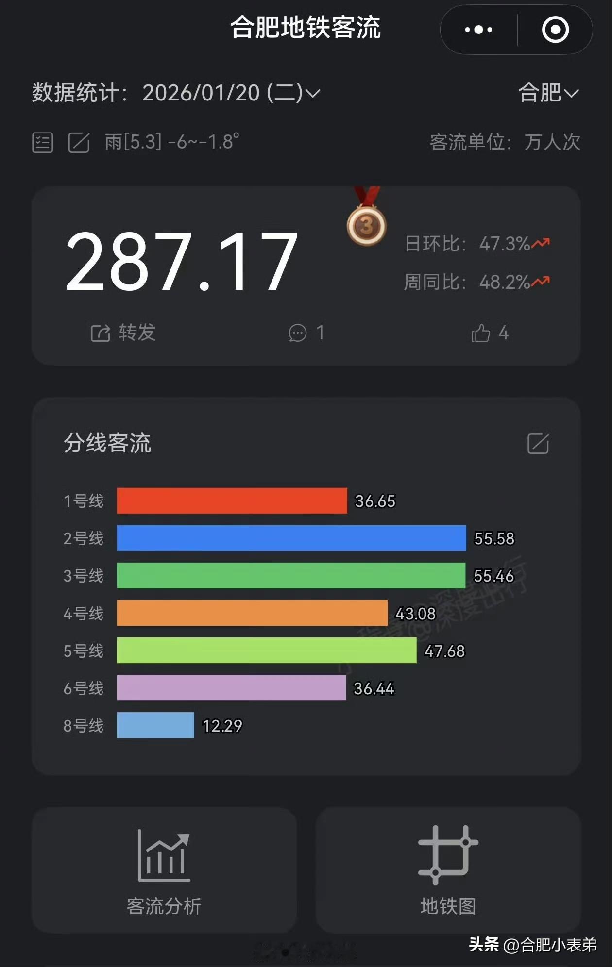 不年不节,一场降雪结冰,直接把合肥地铁客流推上287万,创下历史第三! 上班族集体转乘地铁,合肥地铁稳稳扛起大任,昨天预判会创纪录,果然没让人失望。 客流格局也悄悄变了:3号线强势崛起,快追上2号线;1号线反而有点“拉胯”,客流快被6号线赶超。 听说下周还有雪,大概率客流还会再冲一波。 恶劣天气才懂:地铁房,是真·通勤安全感天花板[赞]!