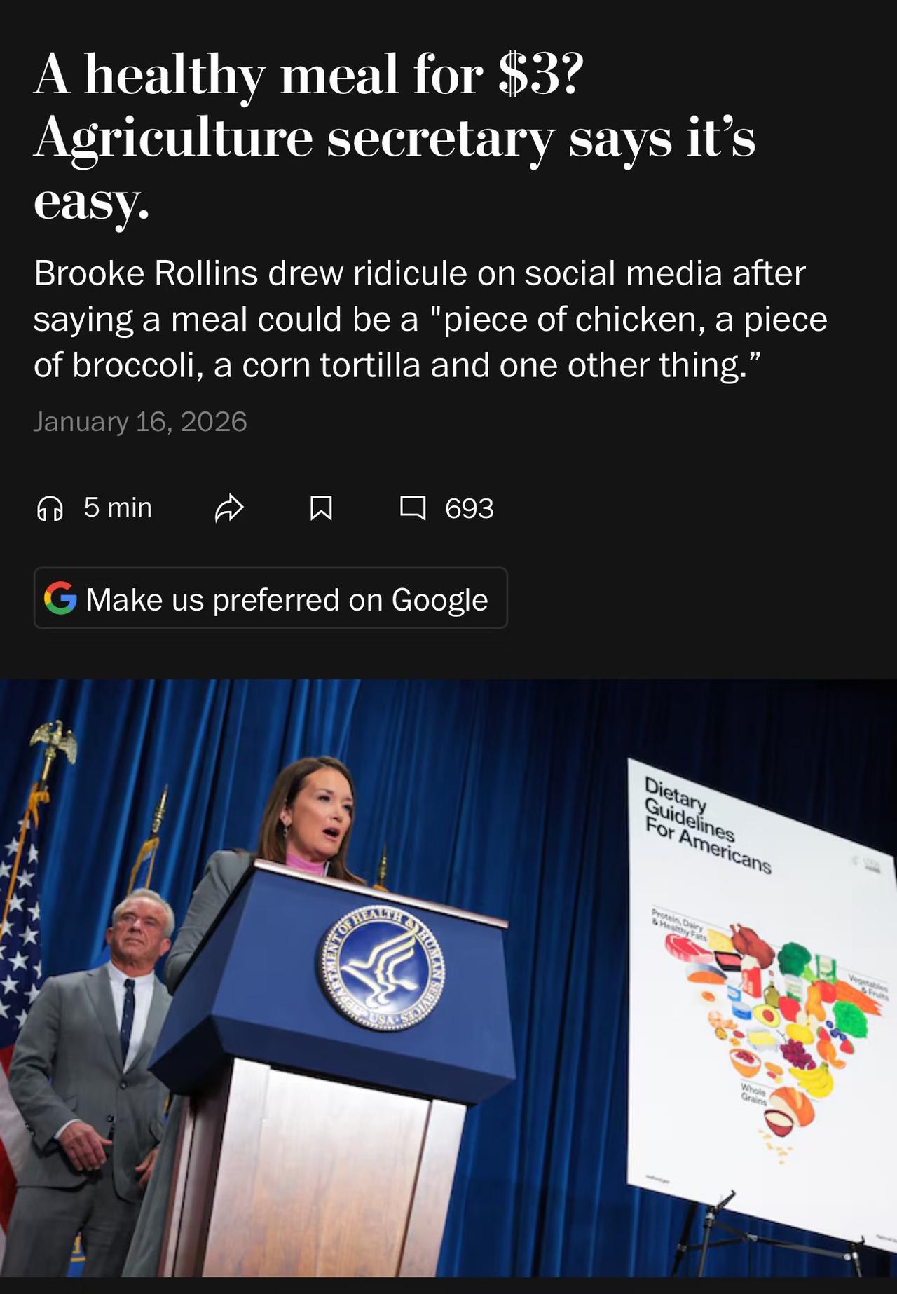 美国农业部长说:3美元就可以吃顿好的 Brooke Rollins在社交媒体上说一顿饭可以是“一块鸡肉、一块西兰花、一个玉米饼和其他东西” 对于美国人来说,吃得好是种什么概念呢?吃点高糖高油维持肚子不饿就算是好的么?