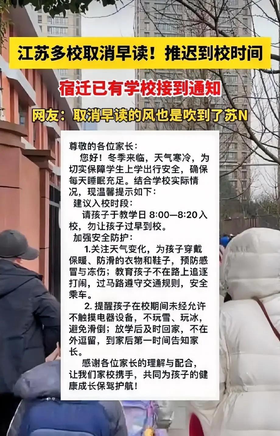 江苏多地延迟到校、取消早读,尤其大冬天,我举双手赞成!孩子睡不够,学个啥? 科学早证明,缺觉的孩子脑子一团浆糊,效率低还伤身体伤情绪。冬天五六点天漆黑,逼娃从热被窝爬出来顶着寒风上学,大人想想都遭罪!路上又冷又危险,到校第一节课还在梦游,这早到的意义在哪?纯粹折腾人! 再说早读,多少娃是闭着眼念经?效果真没想象中好。取消它,让孩子多睡会儿,或者搞点灵活有用的晨间活动,老师和学生都解脱!家长愁送娃?这确实要解决,但方法该是推动弹性上班、完善课后服务,不能总让孩子牺牲睡眠给大人时间表买单! 说到底,比谁到校早没意思!教育是育人,不是“早起竞赛”。让孩子冬天多睡半小时,换来清醒的脑子、健康的身体、安全的上学路,这才叫实在!少点形式主义的苦,多点人性化的暖,这调整,必须挺!取消延时和早读 江苏教育新规