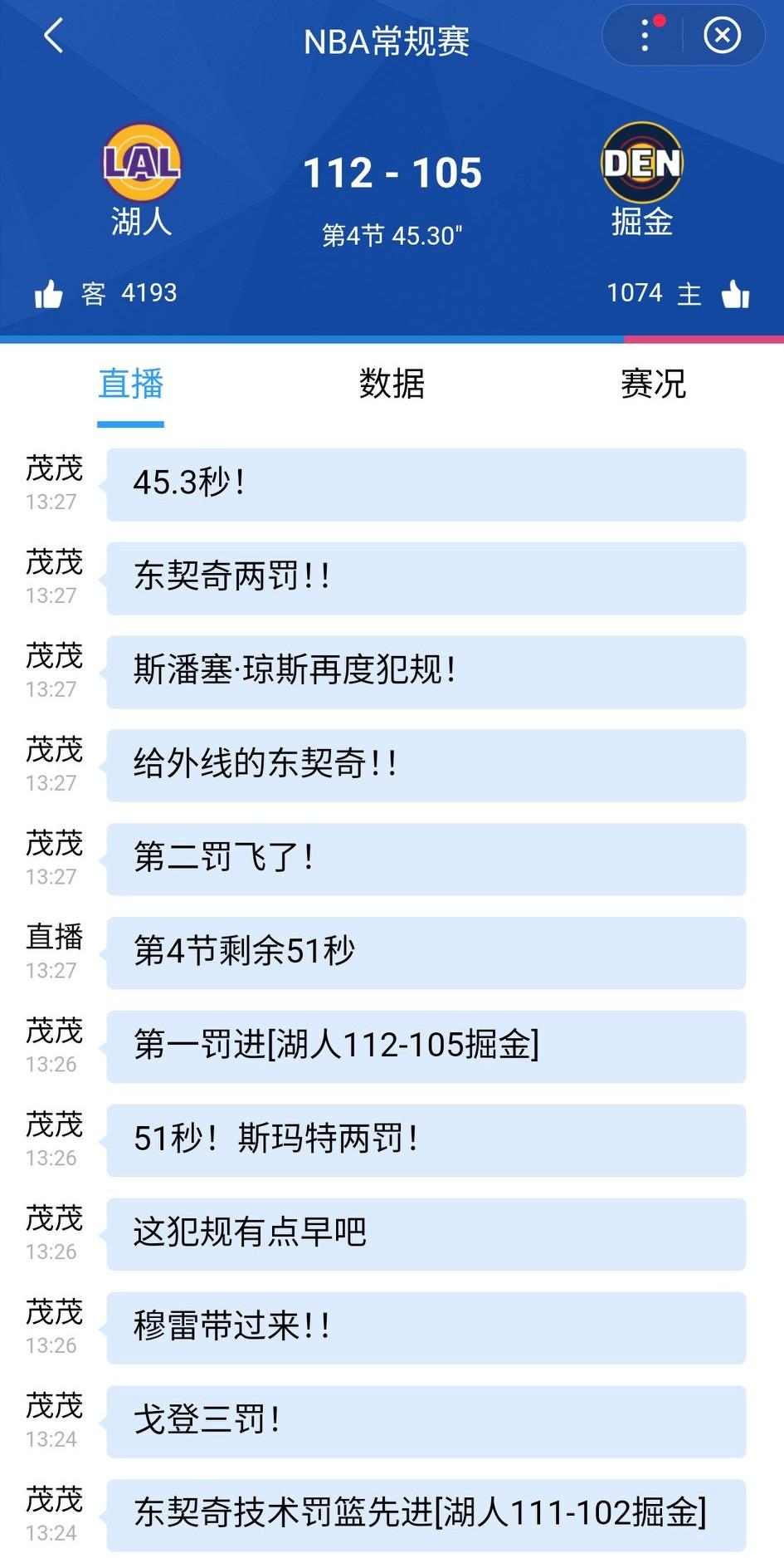 湖人打出一波16-0,真是逆天改命,斯玛特让人又爱又恨,时间只有1分半,不会有什么幺蛾子吧? 湖人111-102掘金,斯玛特三分犯规,戈登三次罚球。 现在基本稳了。湖人112-105掘金,时间只剩45秒。 谁能想到湖人能打出这样的逆天比赛,大赞!