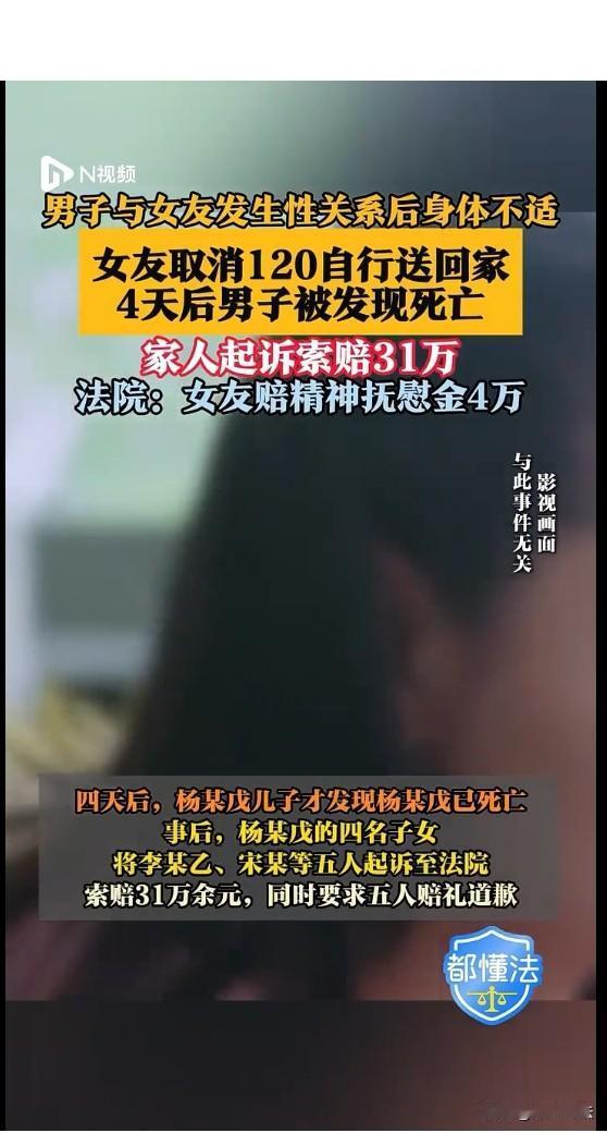 山西太原,杨某一大早就赶往女友李某家中,和对方发生了男女关系。后来杨某身体不适,意识逐渐模糊,李某却没有拨打120,而是叫来了朋友宋某,宋某劝她还是拨打120好,不过李某拨打后又回电说不用了,转而又喊了另外三个朋友来,五个人一起把杨某送到了他的家中。离开时,李某并未告知杨某的四个子女相关情况,直到四天后,杨某的儿子上门看望时,才发现父亲躺在床上离世。最后,杨某的子女直接起诉李某和另外四个人,要求赔偿31万余元。 据南方都市报道,2023年5月7日上午,中年男子杨某接到女友李某的电话,李某关心地说:“快点过来吃早饭,我已经做好了,都是你喜欢吃的。” 杨某高兴得不得了,在自己这把年纪还能谈一个对自己如此关心的女友,实在不易,得好好珍惜。 于是他赶紧穿好衣服,径直打车赶到了李某的小区,还给李某带来了很多好吃的零食。 一进门,两人还没来得及吃美食就拥抱在了一起,想想也有好几天没见面了,实在是一日不见如隔三秋。 就这样,两人发生了男女关系。 本来这是恋爱期间的正常行为,但杨某毕竟不是年轻人,身体突然出现不适,昏昏沉沉的。他赶紧告诉女友李某:“我躺一会儿,有点不舒服,你自己吃早饭吧,别等我了。” 李某看到杨某说完话就沉沉睡去,心里有些害怕,拿不定主意,赶紧把自己的好朋友宋某叫了过来。 她心里没谱,生怕杨某真出什么意外,对方还有四个孩子,到时候没法交代,可别找自己麻烦。 宋某来了之后,看到这种情况也怕担责,赶紧说:“你还是拨打120吧,这样踏实一些。” 李某听从了建议,赶紧拨打了求助电话,不过后来又觉得杨某好像意识清醒了一些,就赶紧回电说不需要了,人好得差不多了。 就这样,两人看着杨某状态时好时坏,觉得让他躺在自己家里实在有点危险,于是协商干脆把杨某送回他自己家中,这样万一有个闪失,也找不到自己的过错。 但两个女人力气小,没法把杨某送回去,李某又拨通了其他三个人的电话,都是平时要好的朋友,让他们来帮帮忙送个人回家。 就这样,五个人一起把杨某背下楼、坐上车,送回了他家中。 当时看到杨某还有呼吸,脸色也稍微正常了一些,这几个人才给他关上灯、关上门离开了。 后来,李某倍感害怕,想想杨某可能有基础病,就不敢再和他交往了,一直没有联系对方。 她当天离开时,也没有告诉杨某的四个子女“你父亲身体不舒服”,也是怕惹一身骚,到时候被大家责怪,自己一把年纪了,被晚辈责怪实在难堪。 就这样过了四天,杨某的儿子上门看望父亲,敲门没听见回应,就直接开门进去,才发现父亲杨某躺在床上已经离世。 后来得知杨某去世前去过李某家中,于是赶紧报了警。 事情调查清楚后,李某并没有有意伤害杨某,只是两人在恋爱期间发生关系后,杨某自身身体产生不适,最后被五人送回了家中。 杨某的四个子女认定是李某的行为不妥,既没有及时送医,又没有告知他们,才导致父亲离世,于是向这五个人索要31万余元赔偿。 不过,五人均认为杨某的去世和他们没有直接关系,是其自身疾病造成的,不应该由他们承担责任,杨某是成年人,对自己的身体不爱惜,应当自行承担责任。 法院也认同了这一说法,杨某的家属并没有拿出有力证据证明杨某的离世和这几人存在直接因果关系,因此驳回了其要求赔偿31万余元的诉讼请求。 《民事诉讼法》第六十七条规定:当事人对自己提出的主张,有责任提供证据(即“谁主张,谁举证”原则)。 由于杨某家属未能举证证明损害结果与五人的行为存在法律上的因果关系,应承担举证不能的法律后果。 在证据不足的情况下,法院判决杨某子女要求赔偿的丧葬费、交通费、补偿金等诉求缺乏依据,驳回其全部诉讼请求。 不过,杨某确实是在李某家中出现不适后被送回家中,这一过程客观上给四个子女造成了精神伤害,毕竟养育自己的父亲突然离世,任谁都会伤心。 《民法典》第一千一百八十三条规定:侵害自然人人身权益造成严重精神损害的,被侵权人有权请求精神损害赔偿。 《最高人民法院关于确定民事侵权精神损害赔偿责任若干问题的解释》第三条规定:死者近亲属因死者相关权益受损遭受精神痛苦的,有权请求精神损害赔偿。 最后,法院判决当事人李某赔偿杨某子女精神损失费4万元,另外四个人共同赔偿精神损失费1万元。 大家都觉得这样的判决很合理,不能因为杨某离世就把责任全部推给李某及另外四个人,毕竟是杨某自身身体出现不适,其自身应承担主要责任; 当然了,李某他们出于人道主义的角度,也不可能一分不赔,人家几个子女失去了父亲,悲痛不已,给予一定的精神补偿是合情合理的。 对于此事,大家如何看待?素材来源于南方都市报道。