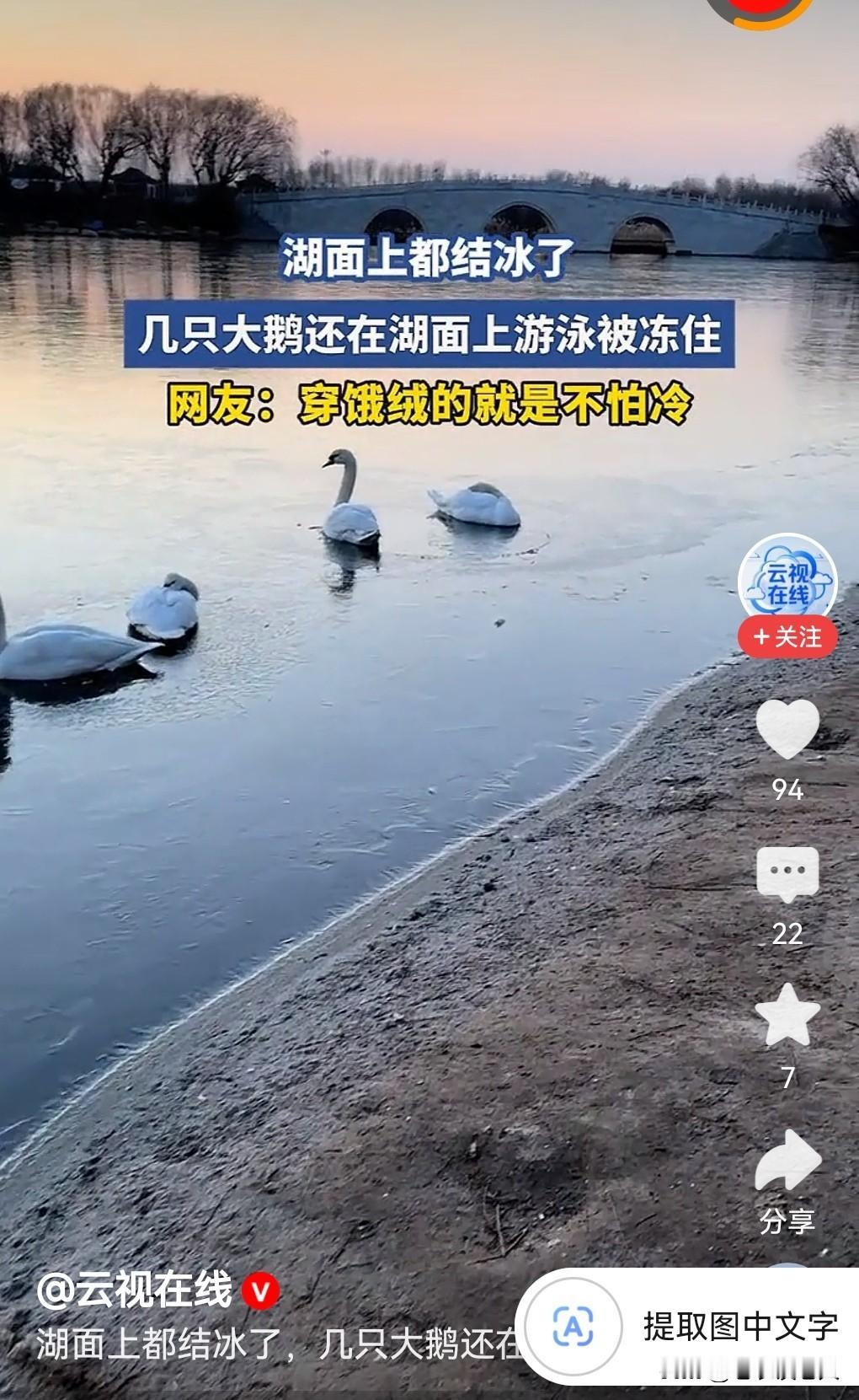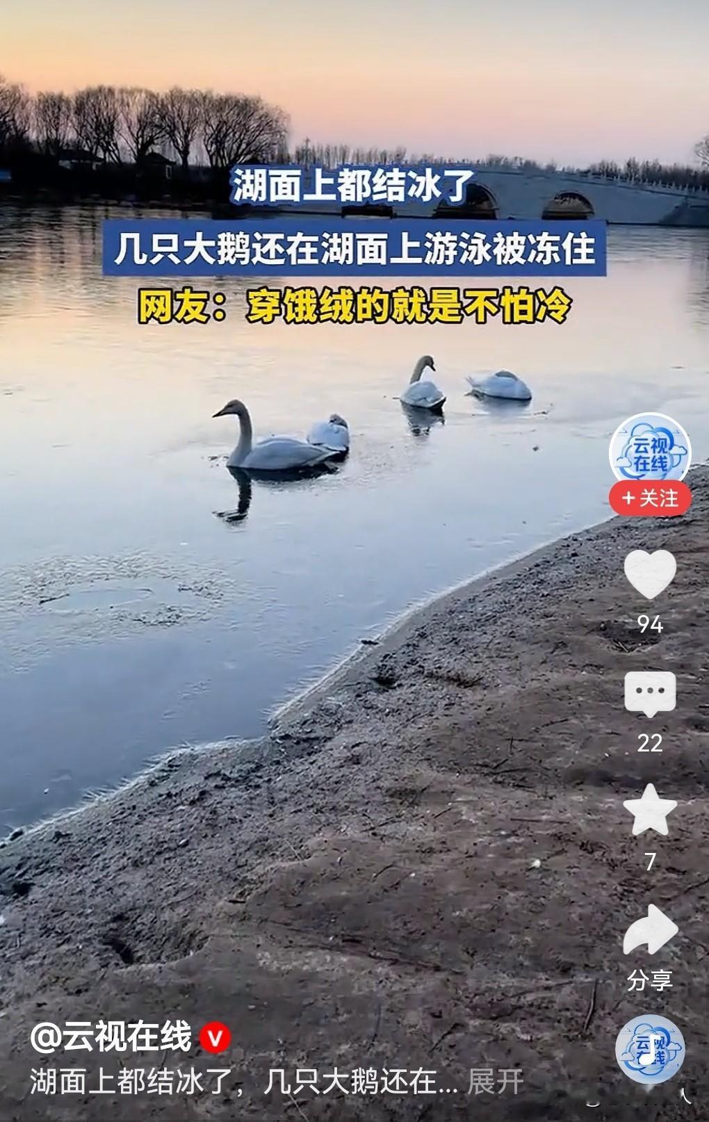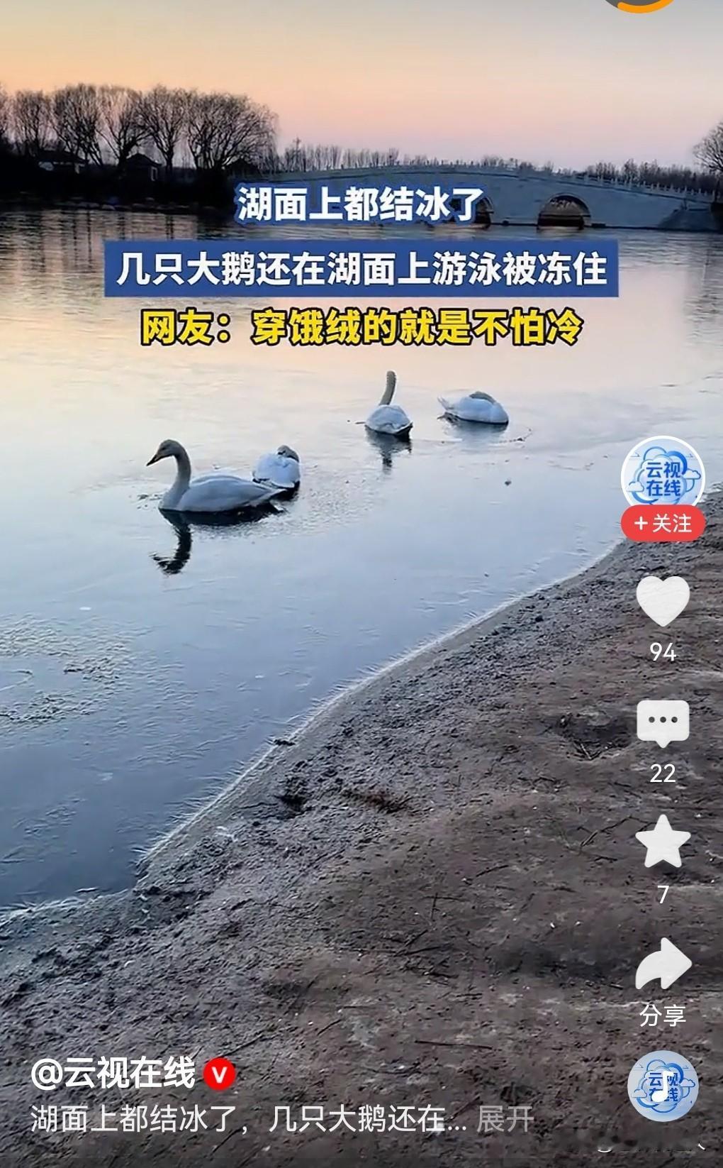 大鹅在湖面上被冻住! 今天是大寒节气的第2天,是四九寒天,冰封雪地,加上近天西北利亚的寒潮来袭我国大部分地区大雪纷飞,滴水成冰,气温极低,天气十分寒冷。在很多地方的湖面上,游泳的大鹅,野生水鸟,被寒冷冻结在湖面上,不能游动了,并不是稀奇事情。 据媒体报道,今天早上有一处湖面上,有几只大鹅被冻住在冰面上,不能游泳运动了。网友调侃,还是“穿鹅绒的就是不怕冷!” 虽然这是一种自然现象,并不稀奇。但是人和动物都是有生命的,都是害怕寒冷的,提醒大家除了要保护好自己的身体以外,还要保护好家里的老人和孩子的身体健康,别让寒冷冻坏了他们的身子。 在这极端异常寒冷的天气,大家要尽量避免室外活动,注意防范老人和小孩在冰封雪地的路面上滑到地上,不要因玩耍乐极生悲,保护好大众的人身安全和健康是每个人的责任。 同时在农村地区,养有家禽家畜的人家,一定要为家禽家畜保暖防寒,避免受到冻害,造成不必要的经济损失。 以上是本人观点,如有不妥,请大家在留言区留下你宝贵的意见,并积极参与评论。