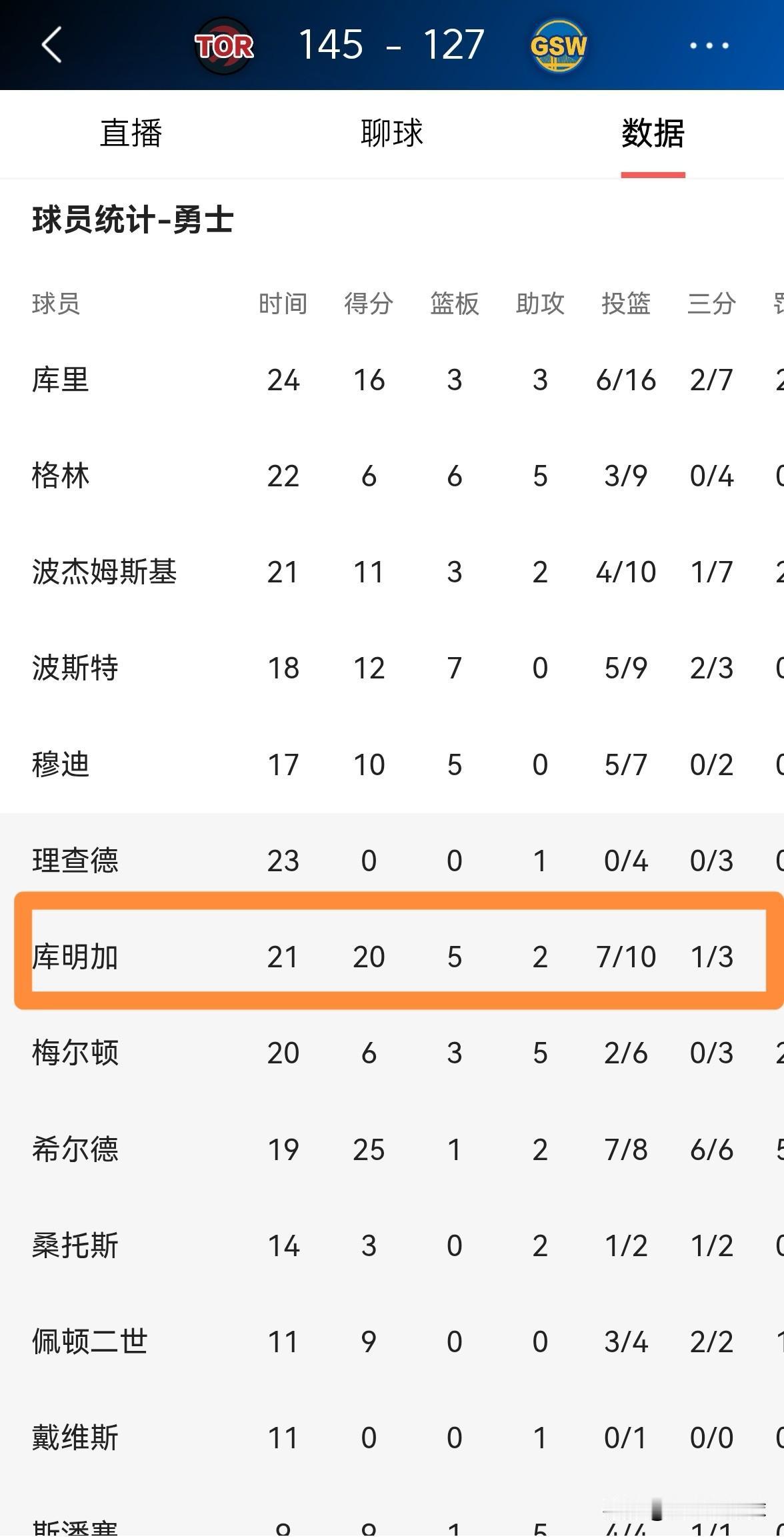 勇士大将库明加狠狠地打了主帅科尔的脸!虽然今天勇士在主场以127:145惨败于猛龙,但是库明加在被重新启用后打出了非常精彩的表现。全场比赛下来,库明加替补出战21分钟,投篮10中7,其中三分球3中1、罚球8中5非常高效的砍下20分,还有5篮板2助攻1抢断,他的场上正负值为+3。 事实证明,科尔教练雪藏库明加的行为是大错特错的,尤其是在巴特勒因伤赛季报销的情况下,库明加成为了帮助勇士保持竞争力的最后一棵稻草。