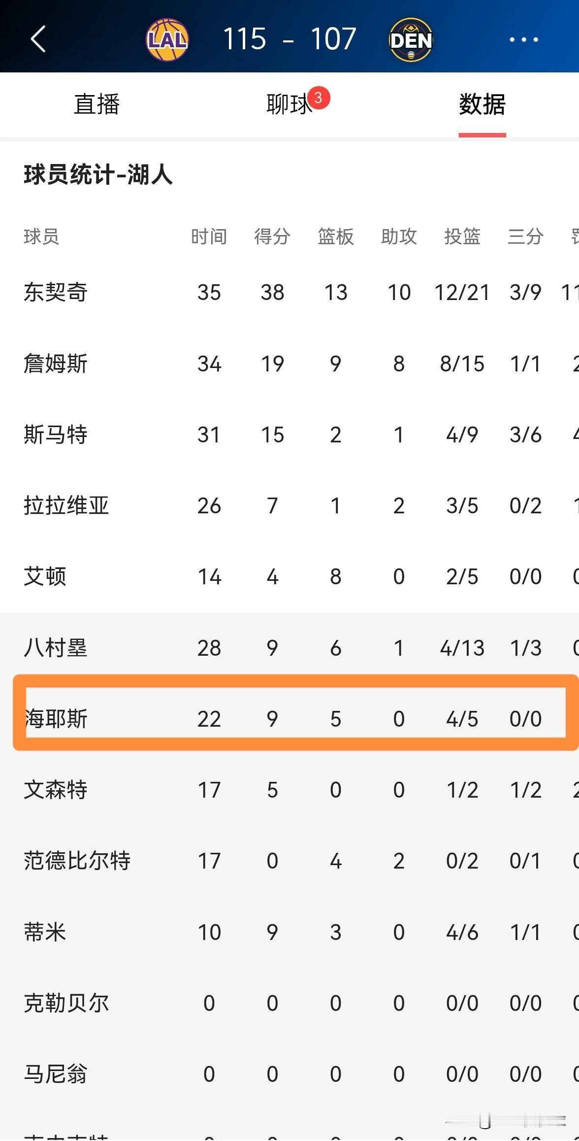 湖人大将海斯真是球队的福将!在今天湖人客场以115:107战胜掘金的比赛中,海斯替补出战22分钟,投篮5中4,其中罚球4中1得到9分5篮板2盖帽,没有出现任何的失误,他的场上正负值为球队最高的+16。 值得注意的是,每当海斯在比赛中打出非常精彩的表现时,湖人的胜率是非常高的,由此可见海斯堪称球队的福将。
