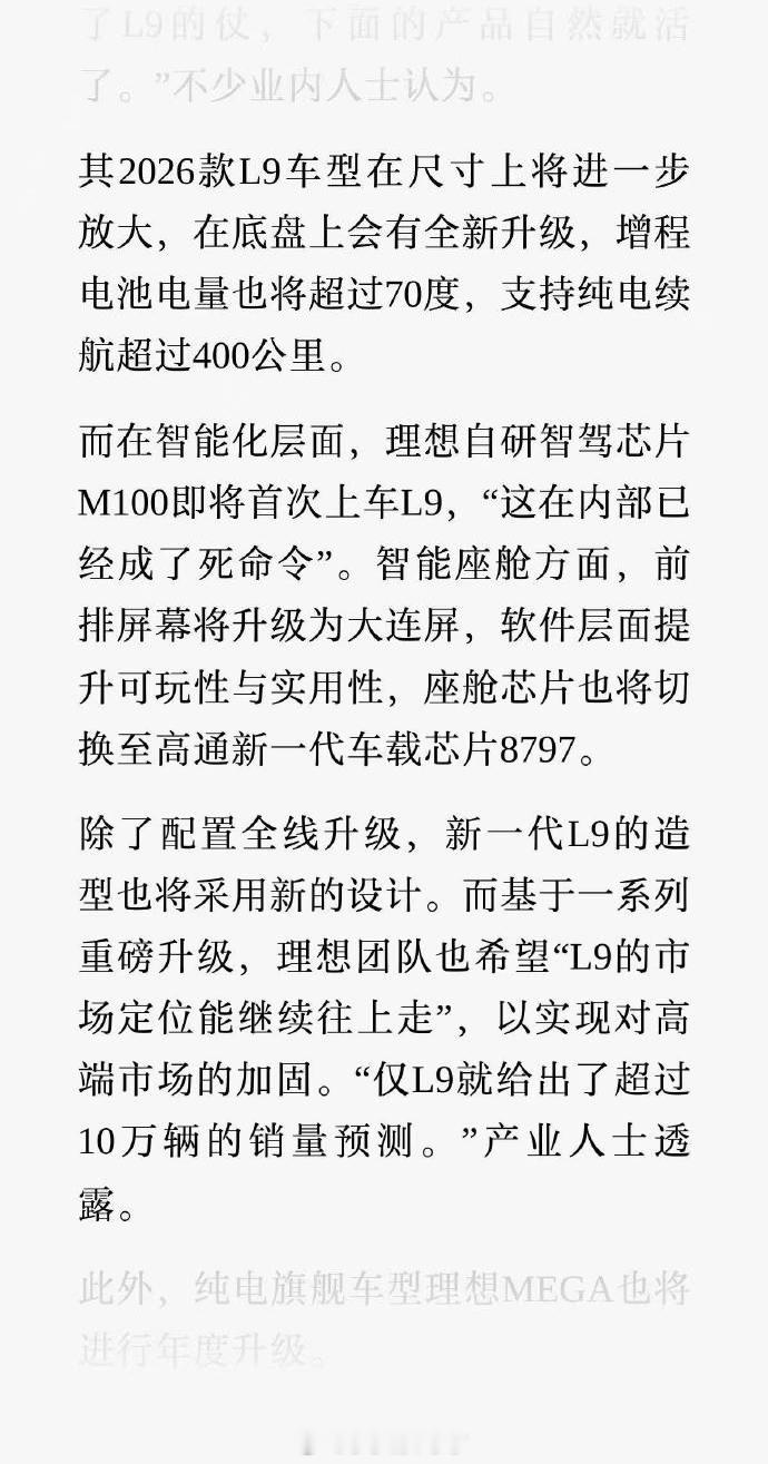 2026款理想L9卷起来:设计与定位:全新造型设计,拔高市场定位。硬件:车身尺寸进一步放大,底盘全新升级,增程电池电量超70度,纯电续航超400公里。智驾:理想自研智驾芯片M100首次上车。智舱:前排屏幕升级为大连屏,座舱芯片切换为高通新一代车载芯片8797,软件层面也会提升可玩性与实用性。销量预期:超过10万辆。2026年,新能源车市场会更卷!大v聊车
