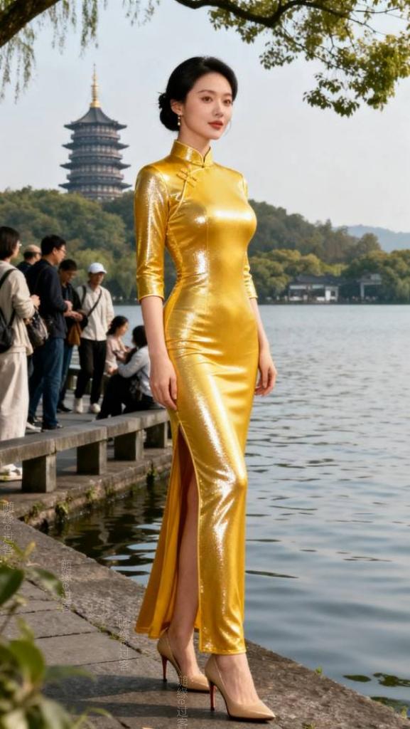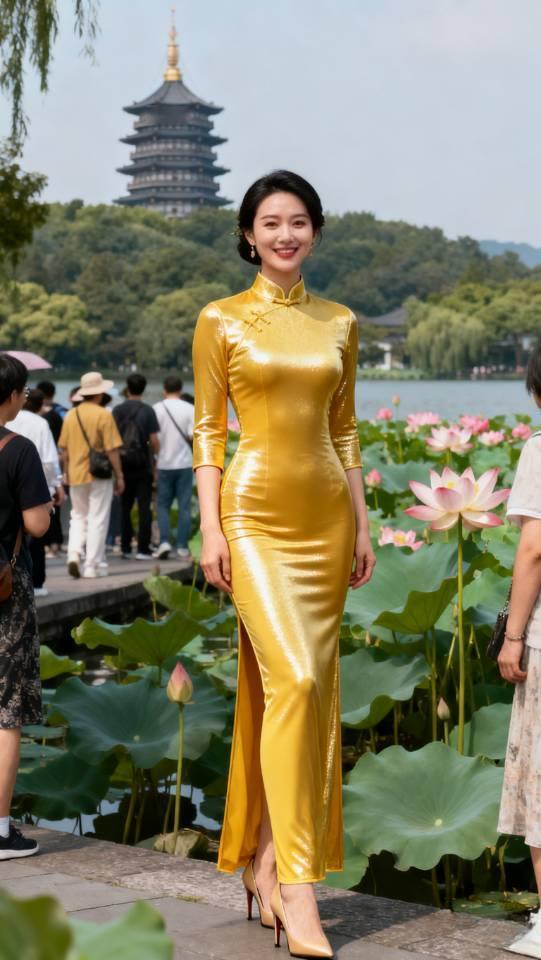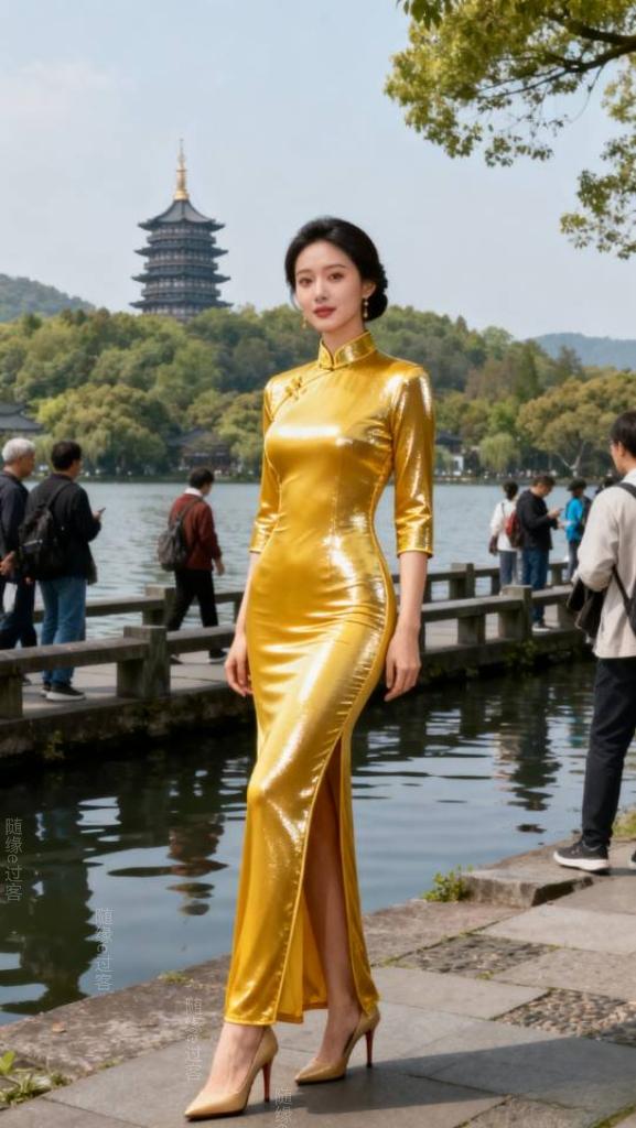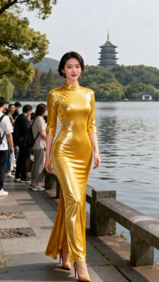 身穿金色旗袍的美女在西湖边拍照。旗袍 旗袍美女 户外景点旗袍秀 旗袍人像照