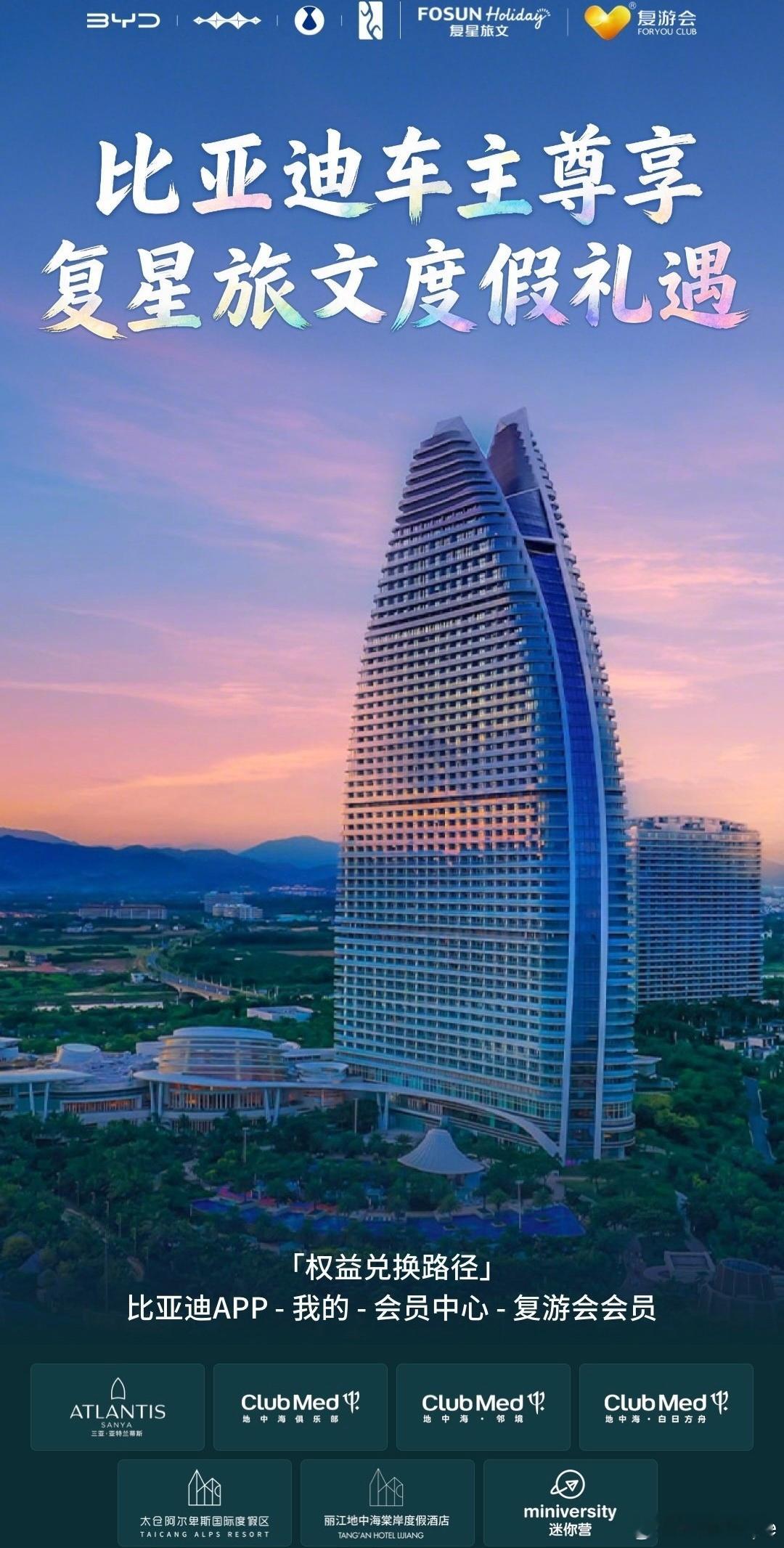 比亚迪×复星战略合作首弹落地🎯去年12月签约太仓,如今权益即刻兑现比亚迪全品牌车主直享亚特兰蒂斯、Club Med等高端度假区会员礼遇出行+度假的品质生活,一步到位✨汽车比亚迪方程豹腾势仰望车主福利复游会会员大v聊车汽车资讯