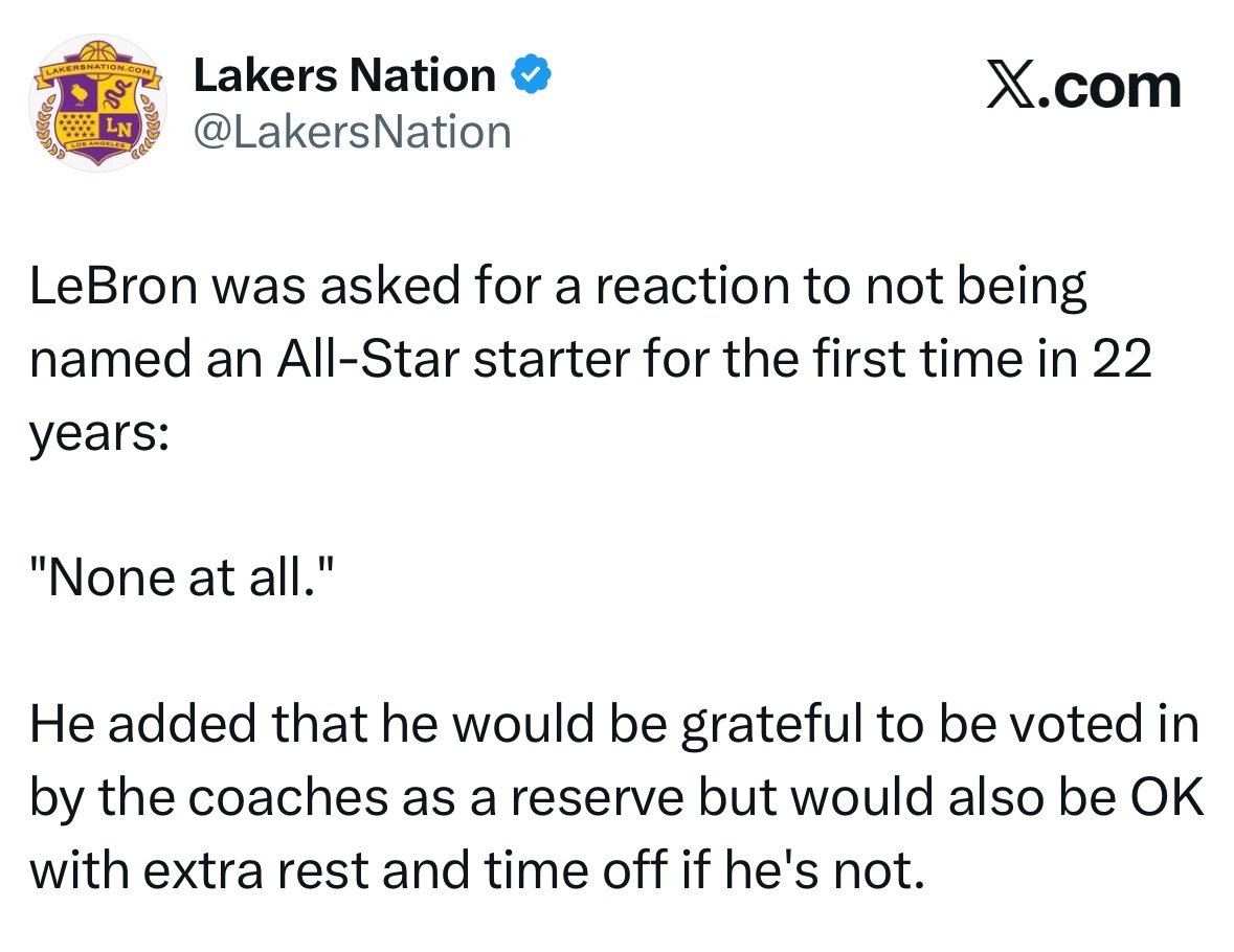 勒布朗被问及22年来首次无缘全明星首发的反应:“完全没有反应。”他补充说,如果被教练们选进替补阵容,他会心存感激;但如果没入选,能多休息、多放几天假,他也完全接受。湖人vs掘金