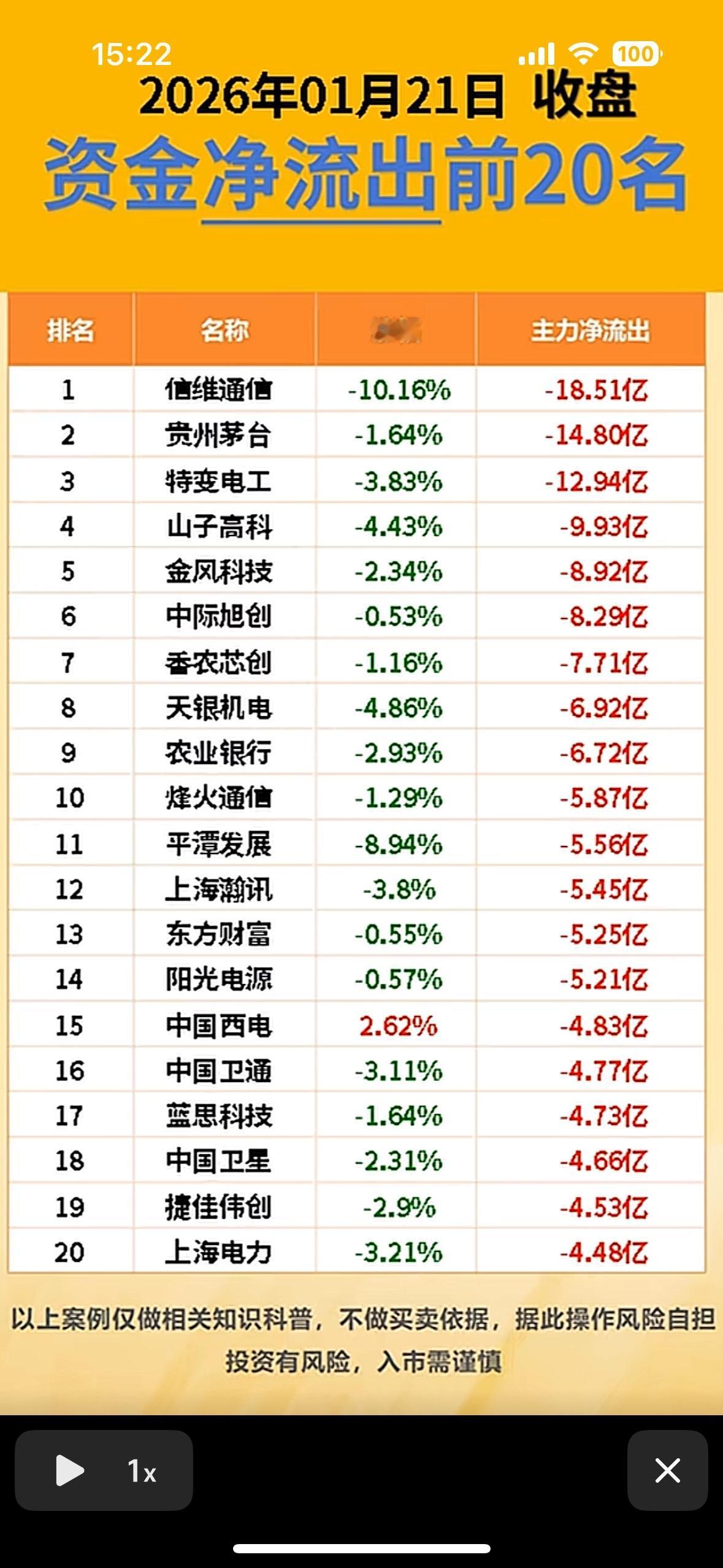 2026年1月21日资金净流出前20名,谨慎投资! 科技股强势领涨,主力资金大