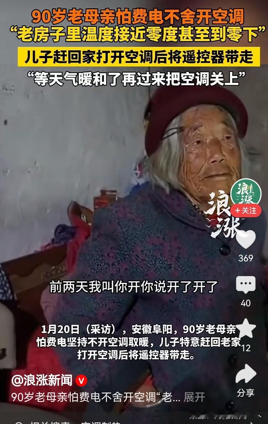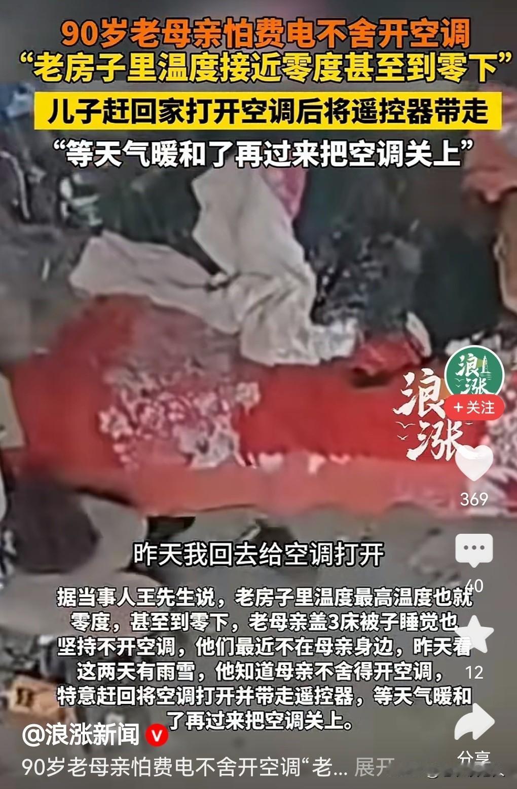 90岁老母亲盖3床被子睡觉,也坚持不开空调,儿子特意赶回家,打开空调后将遥控器带走。 近两天,由于我国受西伯利亚寒流影响,全国绝大多数地区都是大风降温,雨雪天气,气温都降到了零度上下,冰封雪地,天气十分异常寒冷。 作为在外工作打拼挣钱的子女,遇到这种极端天气,都非常挂念和关心家里的老人和孩子冷暖问题,害怕他们在寒冷的冬天,缺衣少被,缺少食物,柔弱的身体受到冻害,影响身体健康。 据报道1月20日报道,在安徽省阜阳市某地,一处老房子里最高温度零度甚至零下,90岁高龄的老太太,盖着3床被子睡觉,也坚持不开空调,儿子特意赶回老家,打开空调后将遥控器带走,等到天气暖和了的时候,再回来把空调关上。多么有孝心的儿子啊! 看了这则新闻,真让人泪目,真让人为此而骄傲,老人有了这么好的儿子,养老问题,晚年赡养问题等等,老太太都不用担心着急,老有所依,老有所养,老有所乐,并不是梦想,是她应该有的福气,要为这位儿子和老人点赞。 现在农村老人都是从过去艰难困苦的岁月里摸爬滚打出来的,都过惯了勤俭节约的日子,害怕多用钱,害怕浪费钱财,是他们生活的理念。 因此,这些老人在家里,宁愿自己多受一点苦,多受一点累,舍不得吃,舍不得花,舍不得多用电,多用气,多用水,为家里能省下一分钱就是一分钱,能为子女帮一把就是一把,真是可怜的善良的老人啊! 现在很多老人害怕子女不孝顺,害怕子女在自己老的时候,不为自己养老送终,其实老人们千万不要有这种疑虑这种想法,相信绝大多数子女,都是有孝心的,有爱心的,是爱护自己的父母的。有的子女目前处在困难时期,对家里的老人顾给不上也是情理之中的事,并不能代表这些子女是不孝顺父母的。 以上是本人观点,如有不妥,请大家在留言区中留下你宝贵的意见,并积极参与评论,一起探讨老人养老的问题。