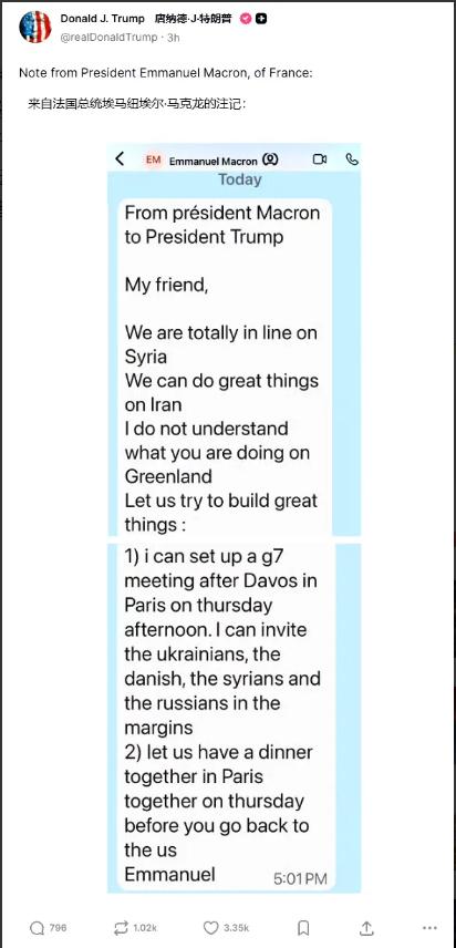 美国总统老特,把法国总统马克龙发给他的私信,给公开到网上了,扒掉了马克龙伪君子的面具。马克龙在公开场合表现得大义凛然,声称对老特的恐吓与威胁绝不屈服。但是马克龙在给老特的私信中却是奴颜婢膝。 马克龙的私信写得很“务实”。他称呼特朗普“我的朋友”,说叙利亚问题上“完全一致”,还主动提出在巴黎张罗G7会议,甚至要拉着乌克兰、俄罗斯、叙利亚代表给特朗普捧场。 最耐人寻味的是那句“我不明白你在格陵兰做什么”——表面是困惑,实则是讨价还价的暗号:你盯着北极那块冰干啥?咱在伊朗能赚更大的钱。 这种商人式的外交话术,和他在达沃斯戴着墨镜痛斥“美国霸凌”的形象,形成刺眼的对冲。 但特朗普不吃这一套。他要的不是虚与委蛇的盟友,而是实打实的服从。 此前马克龙拒绝加入美国主导的加沙“和平委员会”,理由是“担心破坏联合国框架”,这话在特朗普听来就是矫情。 你法国每年往美国卖38亿欧元葡萄酒,我拿200%关税敲你桌子,你转身就递橄榄枝,私下喊朋友,公开装硬汉——这种“既要又要”的做派,正好撞在特朗普的枪口上。 他最烦的就是欧洲政客的“虚伪”:2025年马克龙访美时还搂着肩膀说“让星球再次伟大”,转头就在国会呼吁美国重返多边主义,暗讽特朗普的孤立主义。 现在轮到格陵兰问题,马克龙又玩起台面上下两张皮,特朗普索性掀桌子:既然你要演,我就拆穿你。 这场外交风波的核心,是欧美权力逻辑的错位。马克龙代表的欧洲老牌势力,习惯用“规则”包装利益——嘴上喊着多边主义、国际法,私下算计着葡萄酒关税、中东石油。 特朗普则是纯粹的商人总统,关税威胁、社交媒体曝光,都是他的谈判筹码。 就像马克龙提议在G7场外拉俄罗斯入局,表面是调和矛盾,实则想借普京牵制美国,顺便卖法国的斡旋人情。但特朗普不吃这套,他要的是G7听话,不是欧洲搞平衡。 格陵兰岛的战略价值是其次,关键是马克龙竟敢对美国的“核心利益”说三道四——你私下可以讨价还价,但公开必须站队。 更深层的矛盾藏在数据里。2024年法国对美葡萄酒出口占海外市场的30%,关税翻倍意味着法国酒农要损失数亿欧元。 马克龙的私信里,“共进晚餐”“安排会议”都是软钉子,背后是对经济制裁的恐惧。但他又不能公开服软,毕竟刚在达沃斯骂完“美国霸凌”,转头就跪,国内民意没法交代。 这种骑墙姿态,正好被特朗普抓住把柄:你不是要当欧洲领袖吗?我就让选民看看,你私下怎么求着我谈生意。 最讽刺的是G7会议的安排。马克龙想借轮值主席国的身份,把俄罗斯拉回西方阵营,顺便凸显法国的外交分量。 但特朗普根本不稀罕——他转发私信时,特意漏掉了“邀请俄罗斯”的细节,只留“不理解格陵兰”的质问。 这招很高明:一方面暗示马克龙干涉美国内政,另一方面把水搅浑,让欧洲盟友看看,你们的“领袖”在私下如何迎合美国。 果不其然,消息曝光后,欧盟内部对马克龙的质疑声四起,有人说他“丢了欧洲的脸”,有人担心法美关系彻底破裂。 这场风波的本质,是旧秩序与新玩家的碰撞。马克龙还在用戴高乐时代的“欧洲自主”思维搞外交,以为靠私下勾兑、台面表演就能平衡欧美利益。 但特朗普的社交媒体治国,彻底颠覆了这套规则:所有谈判都可以公开化,所有妥协都可能被曝光。 事实上,欧美之间的利益博弈也永远存在,但特朗普用最粗鲁的方式撕开了遮羞布——在21世纪的外交场,没有绝对的盟友,只有算不清的账本。 马克龙经此一事,或许终于明白:那个喜欢发推特的美国总统,根本不在乎什么“外交体面”,他要的,是真金白银的服从。