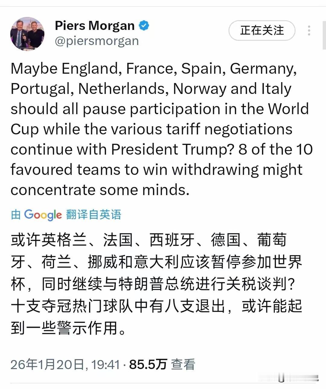 抵制2026年世界杯特朗普或加征关税 今天有人提议英国、法国、西班牙、德国、葡萄牙、荷兰、挪威和意大利应该拒绝参加2026年世界杯,希望这样能够获得美国的重视,毕竟这8支球队可谓是夺冠的热门。 但是特朗普会继续挥舞关税大棒,让这8个国家屈服,因为在特朗普眼中世界杯没有格陵兰岛重要。
