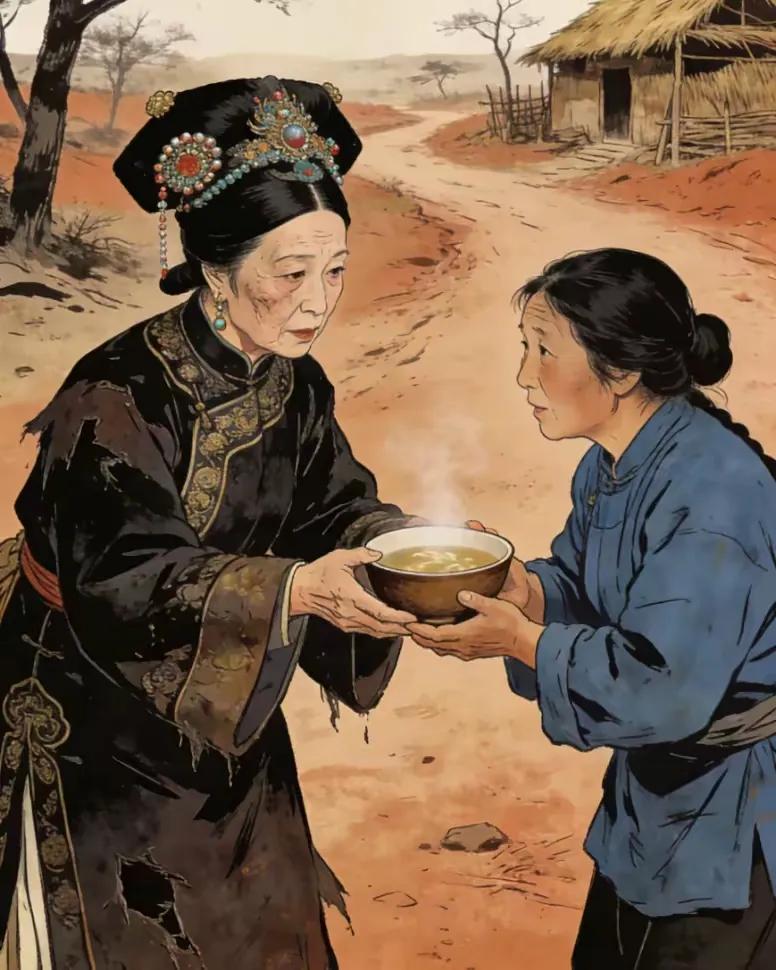 慈禧西逃饿昏,农妇送上一碗热汤,她感动得流泪。回宫后却对李莲英下密令:找到那农妇,赏她3尺白绫。 这事得从1900年说起,八国联军打进北京城,慈禧带着光绪皇帝,裹着一身粗布衣裳,连夜从德胜门出逃。一路往西,车马颠簸,吃的是窝窝头就咸菜,喝的是路边沟里的水。往日里在宫里,她顿顿一百多道菜,燕窝鱼翅都嫌腻,哪遭过这种罪。逃到山西地界时,队伍断了粮,慈禧本来就体弱,加上一路担惊受怕,直接饿晕在破庙里。 随行的太监宫女急得团团转,李莲英跑到附近村子里求救,半天只带回来一个农妇。农妇看着破庙里脸色蜡黄的慈禧,没多问身份,转身回了家,端来一碗热气腾腾的玉米糊糊。那糊糊熬得稠稠的,还撒了一把自家晒的红薯干。慈禧醒过来,闻到香味,顾不上体面,端起碗就大口喝。一碗下肚,身上暖了,眼睛也亮了,拉着农妇的手,眼泪噼里啪啦往下掉。 她哽咽着说,自己是京城来的大户人家,遭了难,日后定要好好报答。农妇憨厚地笑,说一碗糊糊不值钱,出门在外谁都有难处。农妇还留他们歇了一晚,给慈禧铺了干净的麦秸,又煮了一锅粥。第二天临走,慈禧摘下手上的银镯子,塞给农妇,说这是信物,日后拿着镯子去京城找她,必有重谢。农妇推辞不过,只好收下。 谁也没想到,一年后,慈禧坐着銮驾,风风光光回了宫。宫里的奢华日子没过几天,她突然想起了山西那碗玉米糊糊。她跟李莲英念叨,说那农妇心眼好,得赏。李莲英赶紧派人去山西找,没几天就把人带到了京城。 农妇进了宫,看着金碧辉煌的宫殿,吓得腿都软了。直到看见穿着凤袍的慈禧,她才反应过来,当初救的竟是太后老佛爷。慈禧拉着她的手,嘘寒问暖,还让御膳房做了满桌的山珍海味。农妇哪里见过这阵仗,吃饭时,不小心把一粒米饭掉在了地上。她下意识捡起来,塞进嘴里。 就是这个动作,让慈禧的脸色沉了下来。回宫后的这一年,她早就忘了逃难时的窘迫,满脑子都是皇家的体面和威仪。她看着农妇黝黑的脸,粗糙的手,还有那不合时宜的举动,心里突然膈应得慌。她想起自己饿晕在破庙的样子,想起自己狼吞虎咽喝糊糊的狼狈,这些画面,全被这个农妇看在眼里。 她觉得,农妇的存在,就是在提醒所有人,她曾经有过那样不堪的时刻。回宫后的慈禧,容不得任何人触碰她的尊严,哪怕这个人是她的救命恩人。当天晚上,她就对李莲英下了密令,语气冰冷,没有一丝犹豫。 李莲英领了命,心里咯噔一下。他知道太后的脾气,不敢违抗。他让人把那3尺白绫送到农妇的住处,还带去了百两银子。农妇看着白绫,愣了半天,才明白过来是怎么回事。她没哭没闹,只是把那只银镯子拿出来,放在桌上,然后闭上了眼睛。 百两银子被送回了村里,村里人都说,农妇救了太后,却落得这个下场,太冤了。可没人敢说什么,皇家的威严,容不得半点质疑。慈禧后来听说农妇死了,没什么表情,只是让人把那碗玉米糊糊的事,从所有记录里抹去了。 在慈禧的眼里,恩情是分等级的。落魄时的一碗汤,抵不过她回宫后的体面。她可以感动一时,却不能容忍自己的狼狈被人记一辈子。皇权之下,人命如草芥,哪怕是救命之恩,也能被轻飘飘地碾碎。这不是冷血,是刻在骨子里的专制与自私。各位读者你们怎么看?欢迎在评论区讨论。
