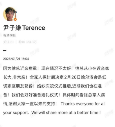 尹子维发文,因徐冬冬家人病重,原定哈尔滨婚礼延期,2.26仅办家庭朋友聚餐,婚纱仪式精心准备后再办