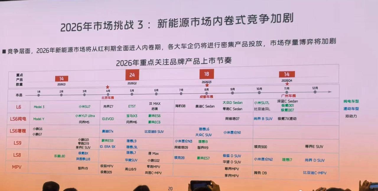 【内部泄密?2026年汽车品牌新车计划全曝光!】 某品牌 无意间公布了2026年几个汽车品牌全新产品的上市时间表。我看了一下,总结的挺全面,基本上也是准确的。一句话总结那就是 2026年的新能源市场,往更大 更豪华了卷!【来自懂车帝车友圈】