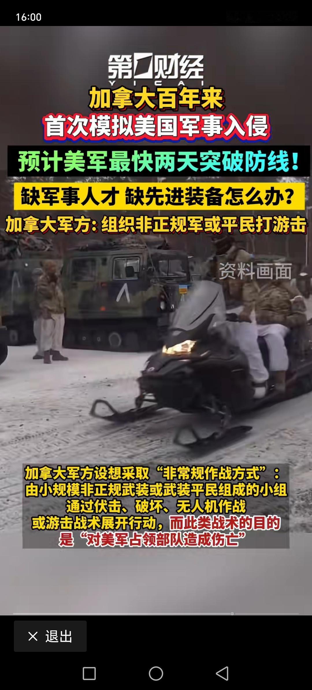 加拿大害怕极了,美国总统特朗普要占格陵兰岛,同时也对加拿大有想法,想把加拿大变成美国第51个州。加拿大国土面积广大,998万平方公里,人口4400多万,典型的是地广人稀。 但是加拿大的自然资源特别丰富,石油储量1680亿桶,居世界第三,天然气储量2万多亿立方米,铀矿全球储量第二,是很多国家的核燃料的供应国,钾储量世界第一,镍资源,石油资源,煤炭资源,森林资源都特别丰富。 加拿大对于美国来说唾手可得,没有一点抵抗力。美国用不着动手,就给他收拾了,英国也不敢过来帮忙。加拿大百年来首次举行模拟美国军事入侵演习,预计美军两天就能突破防线。根本挡不住,现在还组织民兵,非正规军训练,准备打游击。真打起来谁也帮不上忙,远离欧亚大陆。 加拿大还是自求多福吧,就算你不招惹美国,但是你拥有丰富的资源,就被美国早都惦记上。只是时机不成熟,待到山花烂漫时,加拿大在从中笑。