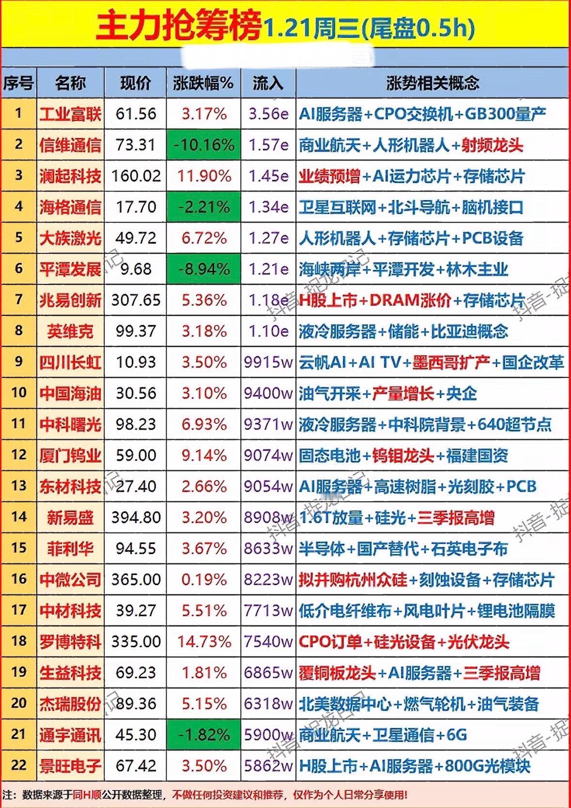 "1月21日主力抢筹榜亮点: AI服务器、存储芯片、卫星导航概念股活跃,中科曙光、厦门钨业领涨,油气装备与商业航天受关注 主力抢筹榜:AI服务器、存储芯片、商业航天等概念股受追捧,多只个股尾盘异动,市场热点轮动活跃。