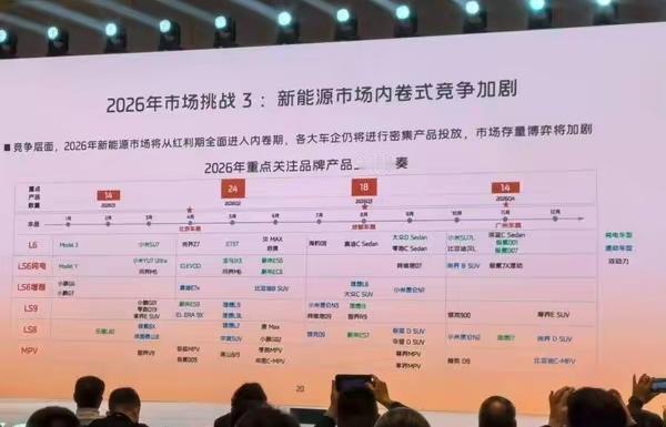 1月20日,智己汽车一份行业分析PPT引发关注,其中意外披露了小米汽车2026年新车规划。 PPT显示,2026年新能源汽车市场将从红利期转入内卷期,车企产品投放密度显著提升。小米计划年内推出6款新车,节奏较往年大幅加快:3月发布新一代SU7及YU7 Ultra;7月推出增程式车型昆仑N3(暂定名);9月上线昆仑N1(暂定名);10月推出SU7L加长版与昆仑N2(暂定名)。 此前,小米2025年交付量达41万辆,超额完成30万辆目标。2026年1月,雷军宣布全年交付目标55万辆,此次曝光的6款新车覆盖纯电、增程、性能及商务等多个细分市场,或成为达成目标的关键支撑。 截至目前,小米与智己均未对PPT内容作出回应。2026年新能源市场竞争态势,或将随各大车企密集上新进一步加剧。【来自懂车帝车友圈】