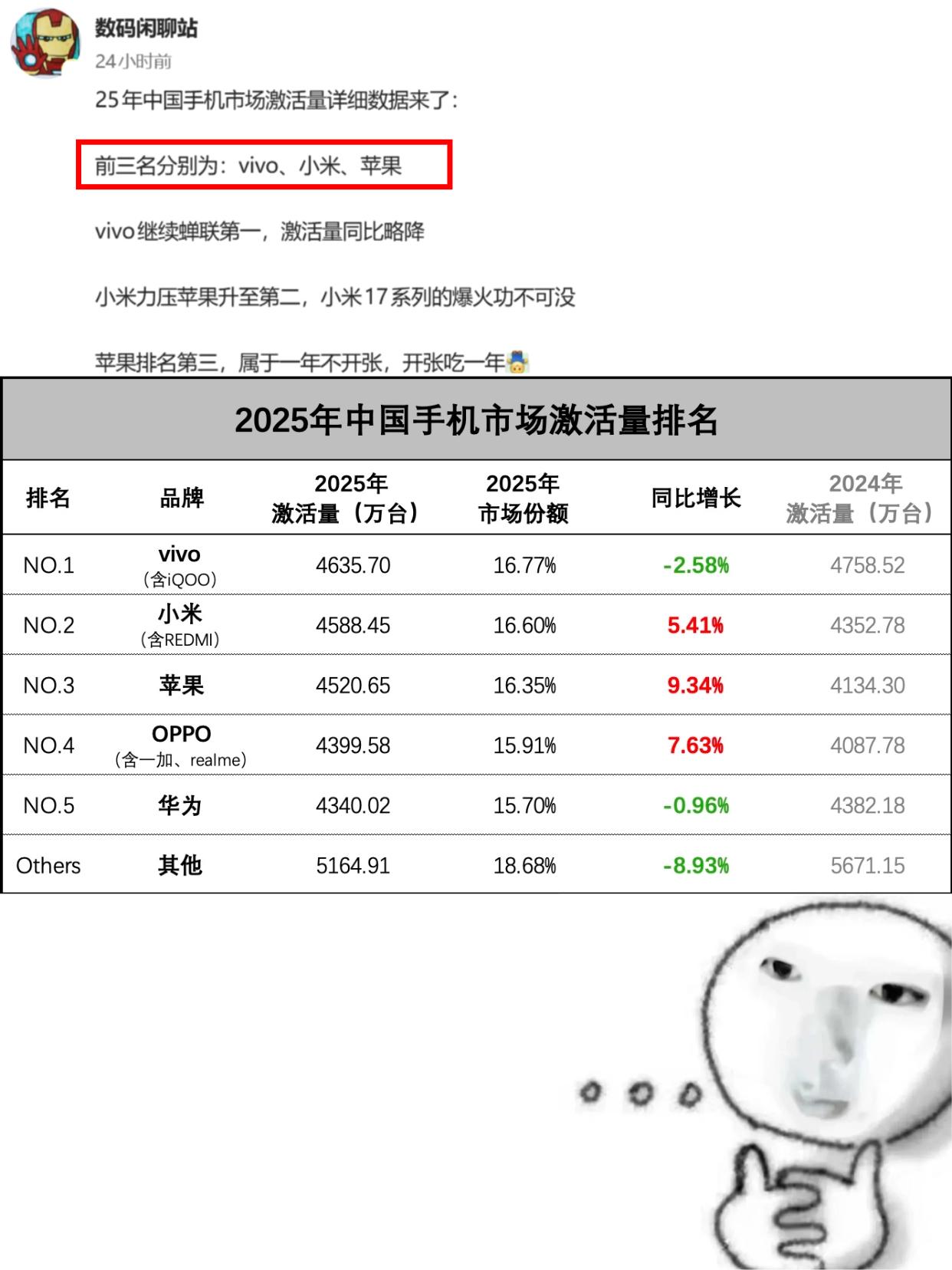笑死,vivo这不是起飞了? 看了下数据,25年国内手机市场激活量前三分别是vivo、小米、苹果,vivo这么强的吗? 激活量跟出货量还不一样,统计的是实际消费者拿到手的数据,感觉含金量还是挺高的啊,vivo这不声不响的,怎么卖这么好的? 不过一看苹果又感觉有点太离谱了,iPhone可都是大几千的,还能有这个量,还有王法吗?