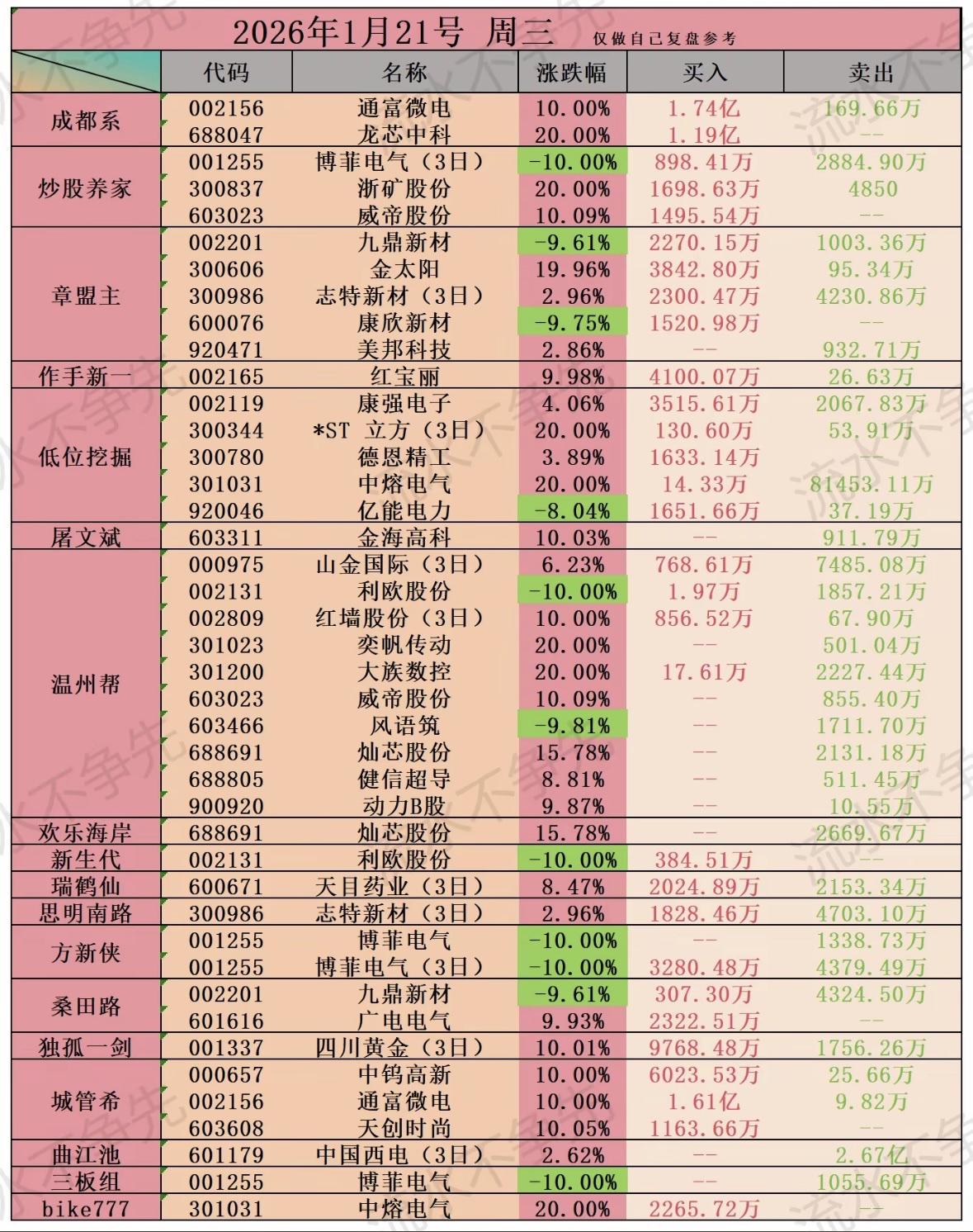 1月21日游资动向:龙芯中科涨停,通富微电获成都系加仓,博菲电气遭抛售,康欣新材跌停,金太阳大涨。 "股市复盘:多股涨跌显著,资金动向活跃,关注热门标的与操盘手策略。"